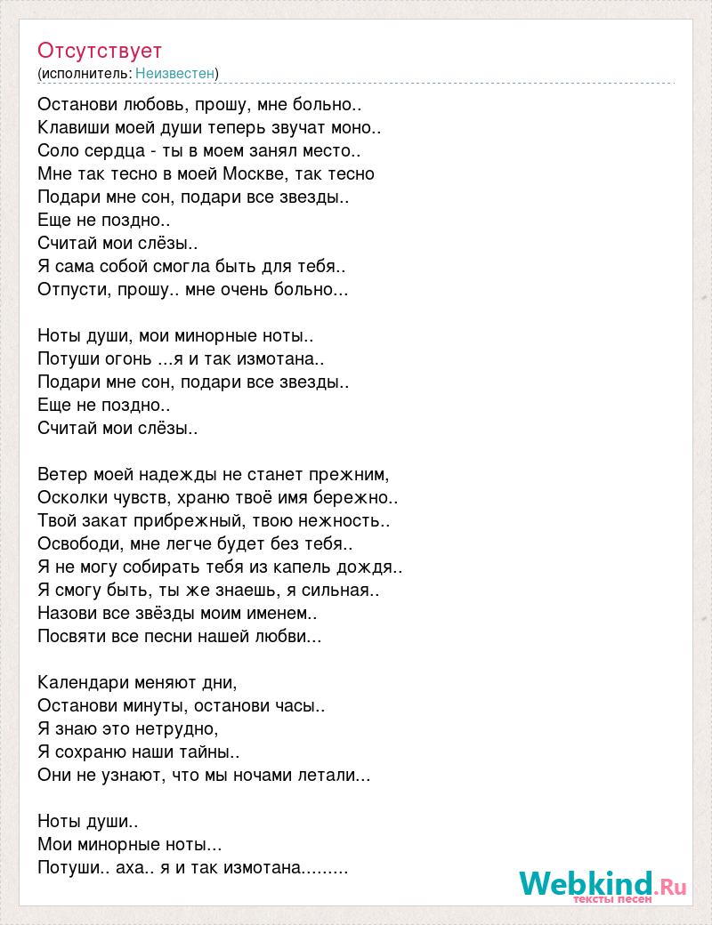 Останови любовь, прошу, мне больно.. Клавиши моей души теперь звучат моно.. Соло сердца - ты в моем занял место.. Мне так тесно в моей Москве, так тесно Подари мне сон, подари все звезды.. Еще не поздно.. Считай мои слёзы.. Я сама собой смогла быть для тебя.. Отпусти, прошу.. мне очень больно... Ноты души, мои минорные ноты.. Потуши огонь ...я и так измотана.. Подари мне сон, подари все звезды.. Еще не поздно.. Считай мои слёзы.. Ветер моей надежды не станет прежним, Осколки чувств, храню твоё имя бережно.. Твой закат прибрежный, твою нежность.. Освободи, мне легче будет без тебя.. Я не могу собирать тебя из капель дождя.. Я смогу быть, ты же знаешь, я сильная.. Назови все звёзды моим именем.. Посвяти все песни нашей любви... Календари меняют дни, Останови минуты, останови часы.. Я знаю это нетрудно, Я сохраню наши тайны.. Они не узнают, что мы ночами летали... Ноты души.. Мои минорные ноты... Потуши.. аха.. я и так измотана.........