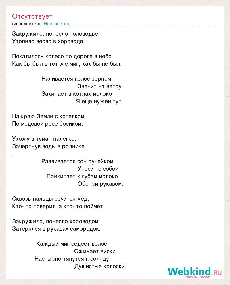 Закружило, понесло половодье Утопило весло в хороводе. Покатилось колесо по дороге в небо Как бы был в тот же миг, как бы не был. Наливается колос зерном Звенит на ветру. Закипает в котлах молоко Я еще нужен тут. На краю Земли с котелком, По медовой росе босиком. Ухожу в туман налегке, Зачерпнув воды в роднике . Разливается сон ручейком Уносит с собой Прикипает к губам молоко Оботри рукавом. Сквозь пальцы сочится мед, Кто- то поверит, а кто- то поймет Закружило, понесло хороводом Затерялся в рукавах самородок. Каждый миг седеет волос Сжимает виски. Настырно тянутся к солнцу Душистые колоски.