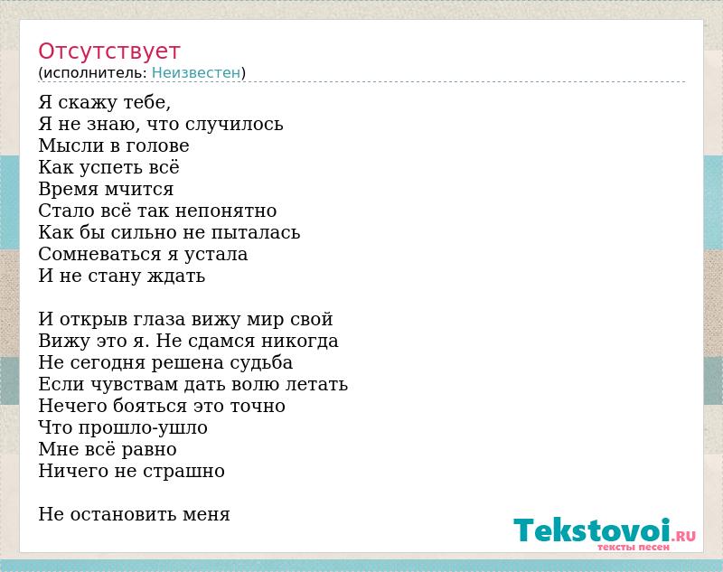 Я скажу тебе, Я не знаю, что случилось Мысли в голове Как успеть всё Время мчится Стало всё так непонятно Как бы сильно не пыталась Сомневаться я устала И не стану ждать И открыв глаза вижу мир свой Вижу это я. Не сдамся никогда Не сегодня решена судьба Если чувствам дать волю летать Нечего бояться это точно Что прошло-ушло Мне всё равно Ничего не страшно Не остановить меня