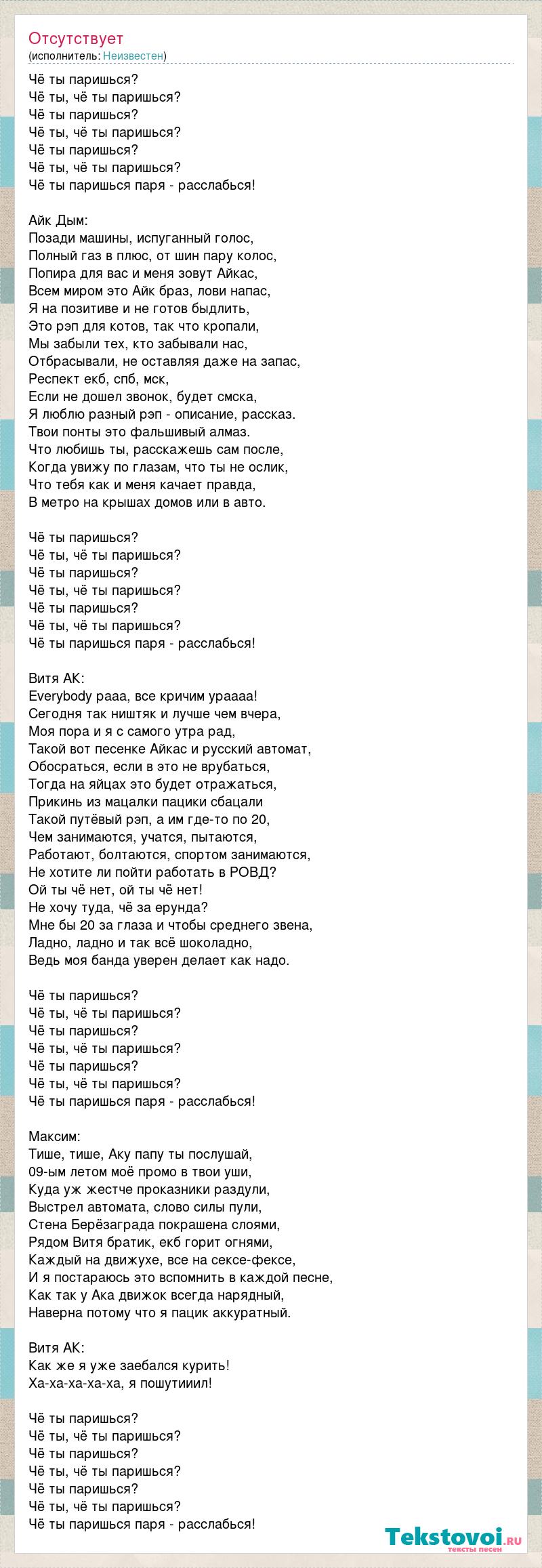 Чё ты паришься? Чё ты, чё ты паришься? Чё ты паришься? Чё ты, чё ты паришься? Чё ты паришься? Чё ты, чё ты паришься? Чё ты паришься паря - расслабься! Айк Дым: Позади машины, испуганный голос, Полный газ в плюс, от шин пару колос, Попира для вас и меня зовут Айкас, Всем миром это Айк браз, лови напас, Я на позитиве и не готов быдлить, Это рэп для котов, так что кропали, Мы забыли тех, кто забывали нас, Отбрасывали, не оставляя даже на запас, Респект екб, спб, мск, Если не дошел звонок, будет смска, Я люблю разный рэп - описание, рассказ. Твои понты это фальшивый алмаз. Что любишь ты, расскажешь сам после, Когда увижу по глазам, что ты не ослик, Что тебя как и меня качает правда, В метро на крышах домов или в авто. Чё ты паришься? Чё ты, чё ты паришься? Чё ты паришься? Чё ты, чё ты паришься? Чё ты паришься? Чё ты, чё ты паришься? Чё ты паришься паря - расслабься! Витя АК: Everybody рааа, все кричим ураааа! Сегодня так ништяк и лучше чем вчера, Моя пора и я с самого утра рад, Такой вот песенке Айкас и русский автомат, Обосраться, если в это не врубаться, Тогда на яйцах это будет отражаться, Прикинь из мацалки пацики сбацали Такой путёвый рэп, а им где-то по 20, Чем занимаются, учатся, пытаются, Работают, болтаются, спортом занимаются, Не хотите ли пойти работать в РОВД? Ой ты чё нет, ой ты чё нет! Не хочу туда, чё за ерунда? Мне бы 20 за глаза и чтобы среднего звена, Ладно, ладно и так всё шоколадно, Ведь моя банда уверен делает как надо. Чё ты паришься? Чё ты, чё ты паришься? Чё ты паришься? Чё ты, чё ты паришься? Чё ты паришься? Чё ты, чё ты паришься? Чё ты паришься паря - расслабься! Максим: Тише, тише, Аку папу ты послушай, 09-ым летом моё промо в твои уши, Куда уж жестче проказники раздули, Выстрел автомата, слово силы пули, Стена Берёзаграда покрашена слоями, Рядом Витя братик, екб горит огнями, Каждый на движухе, все на сексе-фексе, И я постараюсь это вспомнить в каждой песне, Как так у Ака движок всегда нарядный, Наверна потому что я пацик аккуратный. Витя АК: Как же я уже заебался курить! Ха-ха-ха-ха-ха, я пошутииил! Чё ты паришься? Чё ты, чё ты паришься? Чё ты паришься? Чё ты, чё ты паришься? Чё ты паришься? Чё ты, чё ты паришься? Чё ты паришься паря - расслабься!
