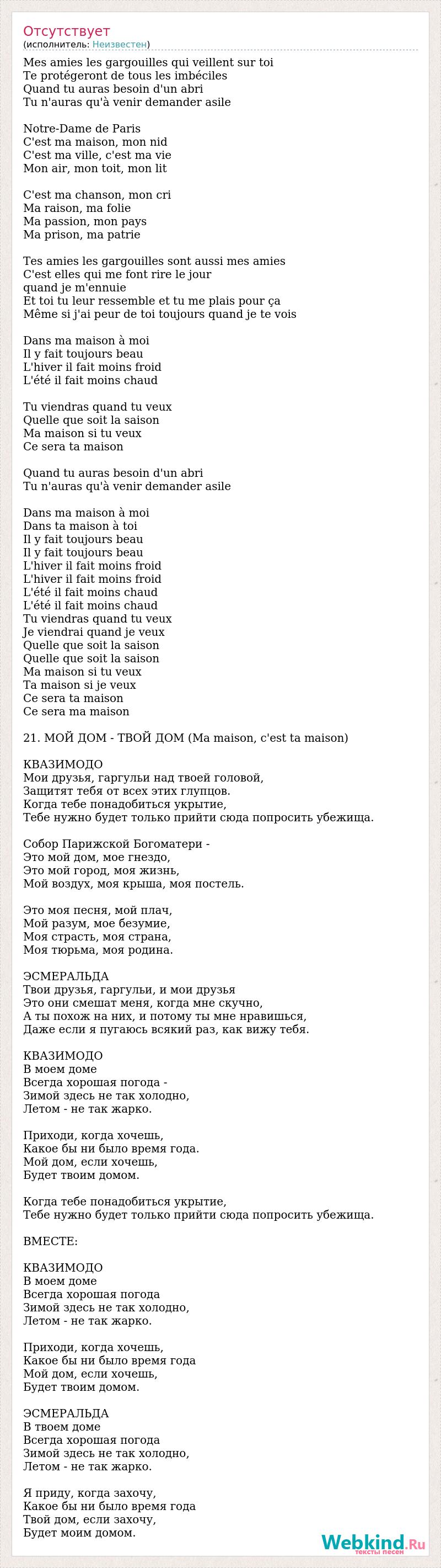 Mes amies les gargouilles qui veillent sur toi Te protégeront de tous les imbéciles Quand tu auras besoin d'un abri Tu n'auras qu'à venir demander asile Notre-Dame de Paris C'est ma maison, mon nid C'est ma ville, c'est ma vie Mon air, mon toit, mon lit C'est ma chanson, mon cri Ma raison, ma folie Ma passion, mon pays Ma prison, ma patrie Tes amies les gargouilles sont aussi mes amies C'est elles qui me font rire le jour quand je m'ennuie Et toi tu leur ressemble et tu me plais pour ça Même si j'ai peur de toi toujours quand je te vois Dans ma maison à moi Il y fait toujours beau L'hiver il fait moins froid L'été il fait moins chaud Tu viendras quand tu veux Quelle que soit la saison Ma maison si tu veux Ce sera ta maison Quand tu auras besoin d'un abri Tu n'auras qu'à venir demander asile Dans ma maison à moi Dans ta maison à toi Il y fait toujours beau Il y fait toujours beau L'hiver il fait moins froid L'hiver il fait moins froid L'été il fait moins chaud L'été il fait moins chaud Tu viendras quand tu veux Je viendrai quand je veux Quelle que soit la saison Quelle que soit la saison Ma maison si tu veux Ta maison si je veux Ce sera ta maison Ce sera ma maison 21. МОЙ ДОМ - ТВОЙ ДОМ (Ma maison, c'est ta maison) КВАЗИМОДО Мои друзья, гаргульи над твоей головой, Защитят тебя от всех этих глупцов. Когда тебе понадобиться укрытие, Тебе нужно будет только прийти сюда попросить убежища. Собор Парижской Богоматери - Это мой дом, мое гнездо, Это мой город, моя жизнь, Мой воздух, моя крыша, моя постель. Это моя песня, мой плач, Мой разум, мое безумие, Моя страсть, моя страна, Моя тюрьма, моя родина. ЭСМЕРАЛЬДА Твои друзья, гаргульи, и мои друзья Это они смешат меня, когда мне скучно, А ты похож на них, и потому ты мне нравишься, Даже если я пугаюсь всякий раз, как вижу тебя. КВАЗИМОДО В моем доме Всегда хорошая погода - Зимой здесь не так холодно, Летом - не так жарко. Приходи, когда хочешь, Какое бы ни было время года. Мой дом, если хочешь, Будет твоим домом. Когда тебе понадобиться укрытие, Тебе нужно будет только прийти сюда попросить убежища. ВМЕСТЕ: КВАЗИМОДО В моем доме Всегда хорошая погода Зимой здесь не так холодно, Летом - не так жарко. Приходи, когда хочешь, Какое бы ни было время года Мой дом, если хочешь, Будет твоим домом. ЭСМЕРАЛЬДА В твоем доме Всегда хорошая погода Зимой здесь не так холодно, Летом - не так жарко. Я приду, когда захочу, Какое бы ни было время года Твой дом, если захочу, Будет моим домом.