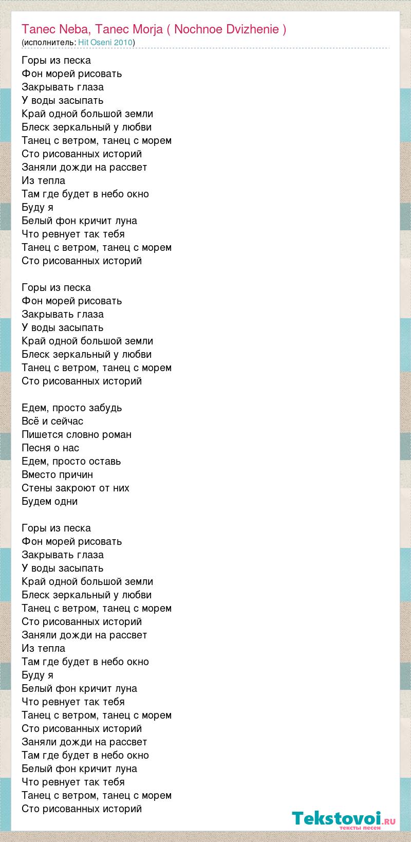 Горы из песка Фон морей рисовать Закрывать глаза У воды засыпать Край одной большой земли Блеск зеркальный у любви Танец с ветром, танец с морем Сто рисованных историй Заняли дожди на рассвет Из тепла Там где будет в небо окно Буду я Белый фон кричит луна Что ревнует так тебя Танец с ветром, танец с морем Сто рисованных историй Горы из песка Фон морей рисовать Закрывать глаза У воды засыпать Край одной большой земли Блеск зеркальный у любви Танец с ветром, танец с морем Сто рисованных историй Едем, просто забудь Всё и сейчас Пишется словно роман Песня о нас Едем, просто оставь Вместо причин Стены закроют от них Будем одни Горы из песка Фон морей рисовать Закрывать глаза У воды засыпать Край одной большой земли Блеск зеркальный у любви Танец с ветром, танец с морем Сто рисованных историй Заняли дожди на рассвет Из тепла Там где будет в небо окно Буду я Белый фон кричит луна Что ревнует так тебя Танец с ветром, танец с морем Сто рисованных историй Заняли дожди на рассвет Там где будет в небо окно Белый фон кричит луна Что ревнует так тебя Танец с ветром, танец с морем Сто рисованных историй