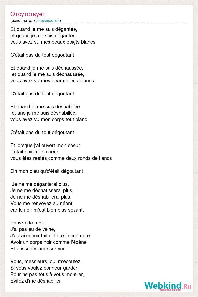 Et quand je me suis dégantée, et quand je me suis dégantée, vous avez vu mes beaux doigts blancs C'était pas du tout dégoutant Et quand je me suis déchaussée, et quand je me suis déchaussée, vous avez vu mes beaux pieds blancs C'était pas du tout dégoutant Et quand je me suis déshabillée, quand je me suis déshabillée, vous avez vu mon corps tout blanc C'était pas du tout dégoutant Et lorsque j'ai ouvert mon coeur, il était noir à l'intérieur, vous êtes [bad word] deux ronds de flancs Oh mon dieu qu'c'était dégoutant Je ne me déganterai plus, Je ne me déchausserai plus, Je ne me déshabillerai plus, Vous me renvoyez au néant, car le noir m'est bien plus seyant, Pauvre de moi, J'ai pas eu de veine, J'aurai mieux fait d' faire le contraire, Avoir un corps [bad word] l'ébène Et posséder âme sereine Vous, messieurs, qui m'écoutez, Si vous voulez bonheur garder, Pour ne pas tous à vous montrer, Evitez d'me déshabiller