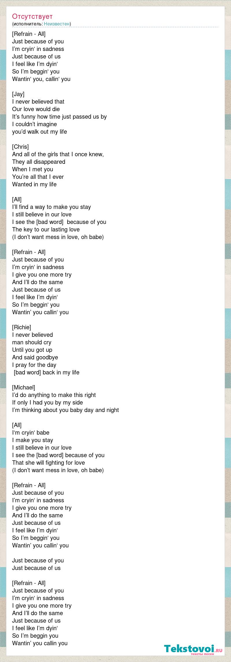 [Refrain - All] Just because of you I’m cryin‘ in sadness Just because of us I feel like I’m dyin‘ So I’m beggin‘ you Wantin‘ you, callin‘ you [Jay] I never believed that Our love would die It’s funny how time just passed us by I couldn’t imagine you’d walk out my life [Chris] And all of the girls that I once knew, They all disappeared When I met you You’re all that I ever Wanted in my life [All] I’ll find a way to make you stay I still believe in our love I see the [bad word] because of you The key to our lasting love (I don’t want mess in love, oh babe) [Refrain - All] Just because of you I’m cryin‘ in sadness I give you one more try And I’ll do the same Just because of us I feel like I’m dyin‘ So I’m beggin‘ you Wantin’ you callin‘ you [Richie] I never believed man should cry Until you got up And said goodbye I pray for the day [bad word] back in my life [Michael] I’d do anything to make this right If only I had you by my side I’m thinking about you baby day and night [All] I‘m cryin‘ babe I make you stay I still believe in our love I see the [bad word] because of you That she will fighting for love (I don’t want mess in love, oh babe) [Refrain - All] Just because of you I’m cryin‘ in sadness I give you one more try And I’ll do the same Just because of us I feel like I’m dyin‘ So I’m beggin‘ you Wantin’ you callin‘ you Just because of you Just because of us [Refrain - All] Just because of you I’m cryin‘ in sadness I give you one more try And I’ll do the same Just because of us I feel like I’m dyin‘ So I’m beggin you Wantin’ you callin you