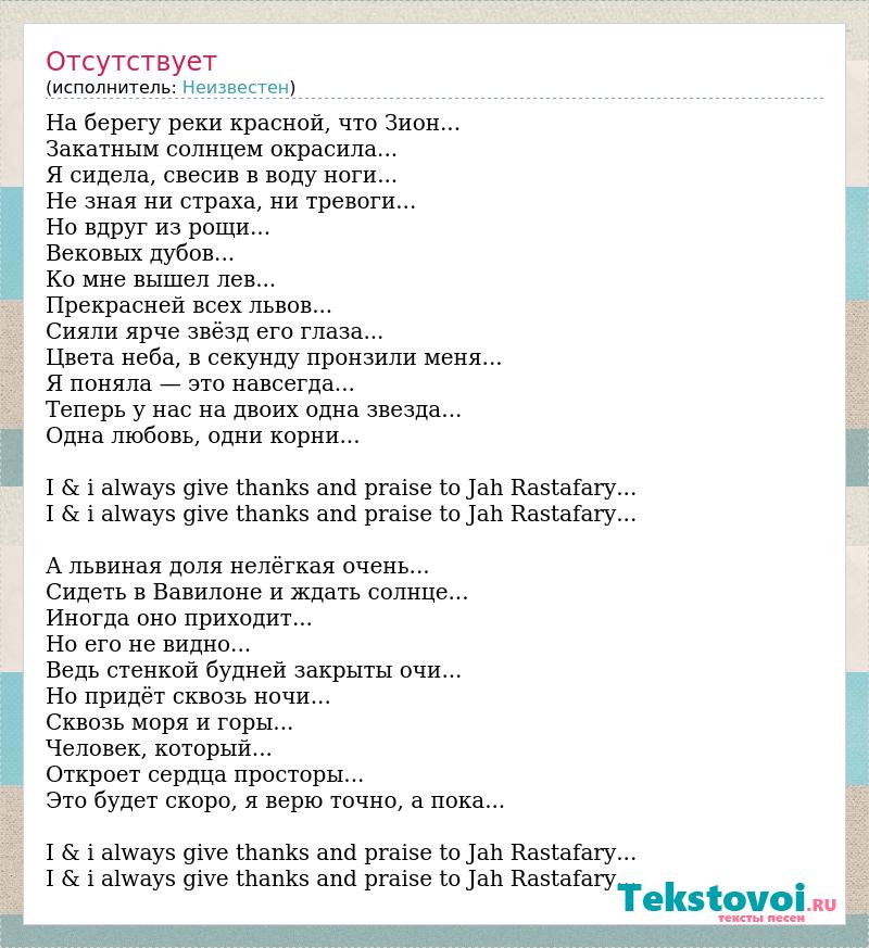На берегу реки красной, что Зион... Закатным солнцем окрасила... Я сидела, свесив в воду ноги... Не зная ни страха, ни тревоги... Но вдруг из рощи... Вековых дубов... Ко мне вышел лев... Прекрасней всех львов... Сияли ярче звёзд его глаза... Цвета неба, в секунду пронзили меня... Я поняла — это навсегда... Теперь у нас на двоих одна звезда... Одна любовь, одни корни... I & i always give thanks and praise to Jah Rastafary... I & i always give thanks and praise to Jah Rastafary... А львиная доля нелёгкая очень... Сидеть в Вавилоне и ждать солнце... Иногда оно приходит... Но его не видно... Ведь стенкой будней закрыты очи... Но придёт сквозь ночи... Сквозь моря и горы... Человек, который... Откроет сердца просторы... Это будет скоро, я верю точно, а пока... I & i always give thanks and praise to Jah Rastafary... I & i always give thanks and praise to Jah Rastafary...