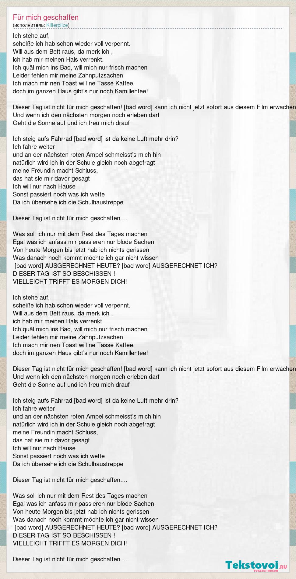 Ich stehe auf, scheiße ich hab schon wieder voll verpennt. Will aus dem Bett raus, da merk ich , ich hab mir meinen Hals verrenkt. Ich quäl mich ins Bad, will mich nur frisch machen Leider fehlen mir meine Zahnputzsachen Ich mach mir nen Toast will ne Tasse Kaffee, doch im ganzen Haus gibt’s nur noch Kamillentee! Dieser Tag ist nicht für mich geschaffen! [bad word] kann ich nicht jetzt sofort aus diesem Film erwachen Und wenn ich den nächsten morgen noch erleben darf Geht die Sonne auf und ich freu mich drauf Ich steig aufs Fahrrad [bad word] ist da keine Luft mehr drin? Ich fahre weiter und an der nächsten roten Ampel schmeisst’s mich hin natürlich wird ich in der Schule gleich noch abgefragt meine Freundin macht Schluss, das hat sie mir davor gesagt Ich will nur nach Hause Sonst passiert noch was ich wette Da ich übersehe ich die Schulhaustreppe Dieser Tag ist nicht für mich geschaffen.... Was soll ich nur mit dem Rest des Tages machen Egal was ich anfass mir passieren nur blöde Sachen Von heute Morgen bis jetzt hab ich nichts gerissen Was danach noch kommt möchte ich gar nicht wissen [bad word] AUSGERECHNET HEUTE? [bad word] AUSGERECHNET ICH? DIESER TAG IST SO BESCHISSEN ! VIELLEICHT TRIFFT ES MORGEN DICH! Ich stehe auf, scheiße ich hab schon wieder voll verpennt. Will aus dem Bett raus, da merk ich , ich hab mir meinen Hals verrenkt. Ich quäl mich ins Bad, will mich nur frisch machen Leider fehlen mir meine Zahnputzsachen Ich mach mir nen Toast will ne Tasse Kaffee, doch im ganzen Haus gibt’s nur noch Kamillentee! Dieser Tag ist nicht für mich geschaffen! [bad word] kann ich nicht jetzt sofort aus diesem Film erwachen Und wenn ich den nächsten morgen noch erleben darf Geht die Sonne auf und ich freu mich drauf Ich steig aufs Fahrrad [bad word] ist da keine Luft mehr drin? Ich fahre weiter und an der nächsten roten Ampel schmeisst’s mich hin natürlich wird ich in der Schule gleich noch abgefragt meine Freundin macht Schluss, das hat sie mir davor gesagt Ich will nur nach Hause Sonst passiert noch was ich wette Da ich übersehe ich die Schulhaustreppe Dieser Tag ist nicht für mich geschaffen.... Was soll ich nur mit dem Rest des Tages machen Egal was ich anfass mir passieren nur blöde Sachen Von heute Morgen bis jetzt hab ich nichts gerissen Was danach noch kommt möchte ich gar nicht wissen [bad word] AUSGERECHNET HEUTE? [bad word] AUSGERECHNET ICH? DIESER TAG IST SO BESCHISSEN ! VIELLEICHT TRIFFT ES MORGEN DICH! Dieser Tag ist nicht für mich geschaffen....