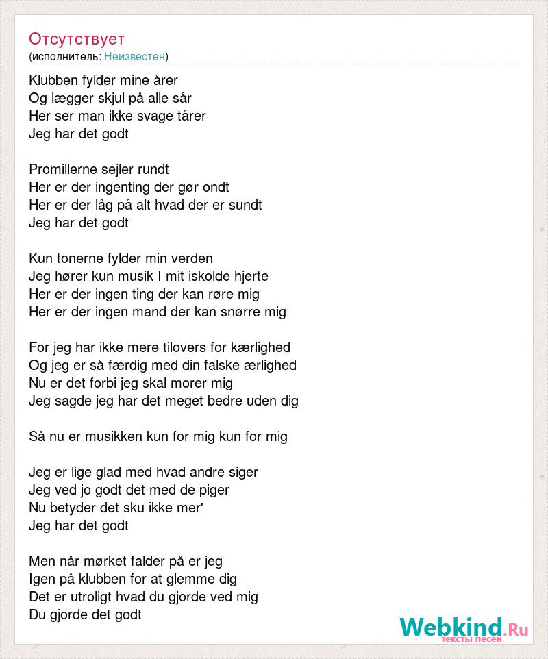Klubben fylder mine årer Og lægger skjul på alle sår Her ser man ikke svage tårer Jeg har det godt Promillerne [bad word] Her er der ingenting der gør ondt Her er der låg på alt hvad der er sundt Jeg har det godt Kun tonerne fylder min verden Jeg hører kun musik I mit iskolde hjerte Her er der ingen ting der kan røre mig Her er der ingen mand der kan snørre mig For jeg har ikke mere tilovers for kærlighed Og jeg er så færdig med din falske ærlighed Nu er det forbi jeg skal morer mig Jeg sagde jeg har det meget bedre uden dig Så nu er musikken kun for mig kun for mig Jeg er lige glad med hvad andre siger Jeg ved jo godt det med de piger Nu betyder det sku ikke mer' Jeg har det godt Men når mørket falder på er jeg Igen på klubben for at glemme dig Det er utroligt hvad du gjorde ved mig Du gjorde det godt