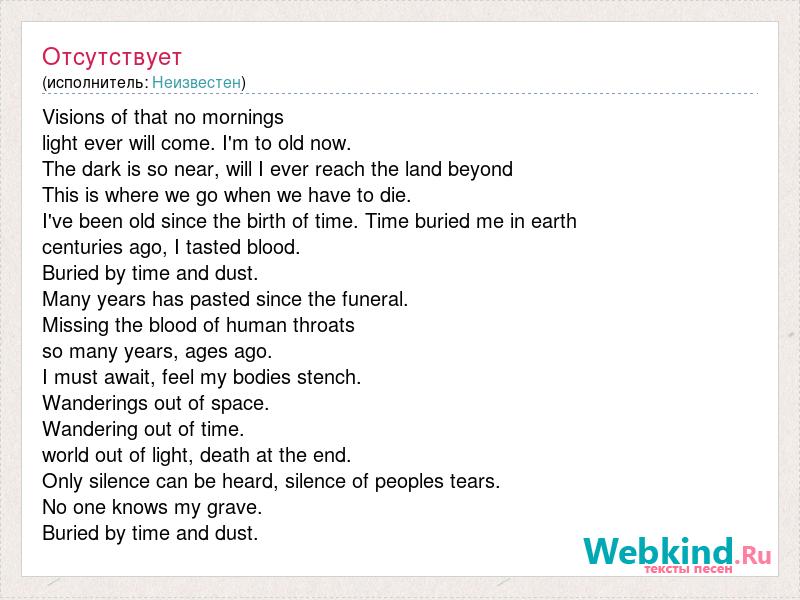 Visions of that no mornings light ever [bad word] I'm to old now. The dark is so near, will I ever reach the land beyond This is where we go when we have to die. I've been old since the birth of time. Time buried me in earth centuries ago, I tasted blood. Buried by time and dust. Many years has pasted since the funeral. Missing the blood of human throats so many years, ages ago. I must await, feel my bodies stench. Wanderings out of space. Wandering out of time. world out of light, death at the end. Only silence can be heard, silence of peoples tears. No one knows my grave. Buried by time and dust.
