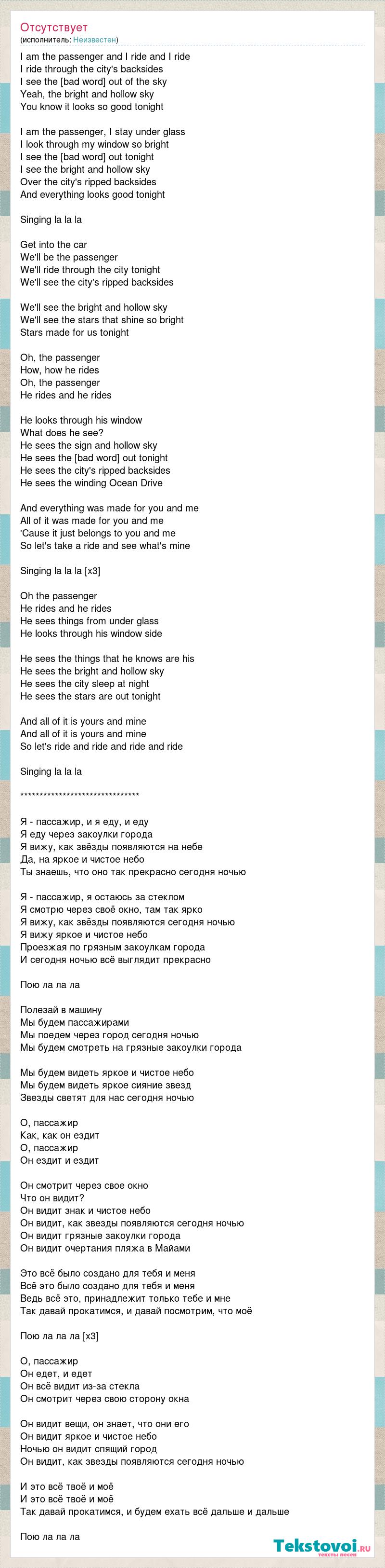 I am the passenger and I ride and I ride I ride through the city's backsides I see the [bad word] out of the sky Yeah, the bright and hollow sky You know it looks so good tonight I am the passenger, I stay under glass I look through my window so bright I see the [bad word] out tonight I see the bright and hollow sky Over the city's ripped backsides And everything looks good tonight Singing la la la Get into the car We'll be the passenger We'll ride through the city tonight We'll see the city's ripped backsides We'll see the bright and hollow sky We'll see the stars that shine so bright Stars made for us tonight Oh, the passenger How, how he rides Oh, the passenger He rides and he rides He looks through his window What does he see? He sees the sign and hollow sky He sees the [bad word] out tonight He sees the city's ripped backsides He sees the winding Ocean Drive And everything was made for you and me All of it was made for you and me 'Cause it just belongs to you and me So let's take a ride and see what's mine Singing la la la [x3] Oh the passenger He rides and he rides He sees things from under glass He looks through his window side He sees the things that he knows are his He sees the bright and hollow sky He sees the city sleep at night He sees the stars are out tonight And all of it is yours and mine And all of it is yours and mine So let's ride and ride and ride and ride Singing la la la ******************************* Я - пассажир, и я еду, и еду Я еду через закоулки города Я вижу, как звёзды появляются на небе Да, на яркое и чистое небо Ты знаешь, что оно так прекрасно сегодня ночью Я - пассажир, я остаюсь за стеклом Я смотрю через своё окно, там так ярко Я вижу, как звёзды появляются сегодня ночью Я вижу яркое и чистое небо Проезжая по грязным закоулкам города И сегодня ночью всё выглядит прекрасно Пою ла ла ла Полезай в машину Мы будем пассажирами Мы поедем через город сегодня ночью Мы будем смотреть на грязные закоулки города Мы будем видеть яркое и чистое небо Мы будем видеть яркое сияние звезд Звезды светят для нас сегодня ночью О, пассажир Как, как он ездит О, пассажир Он ездит и ездит Он смотрит через свое окно Что он видит? Он видит знак и чистое небо Он видит, как звезды появляются сегодня ночью Он видит грязные закоулки города Он видит очертания пляжа в Майами Это всё было создано для тебя и меня Всё это было создано для тебя и меня Ведь всё это, принадлежит только тебе и мне Так давай прокатимся, и давай посмотрим, что моё Пою ла ла ла [x3] О, пассажир Он едет, и едет Он всё видит из-за стекла Он смотрит через свою сторону окна Он видит вещи, он знает, что они его Он видит яркое и чистое небо Ночью он видит спящий город Он видит, как звезды появляются сегодня ночью И это всё твоё и моё И это всё твоё и моё Так давай прокатимся, и будем ехать всё дальше и дальше Пою ла ла ла