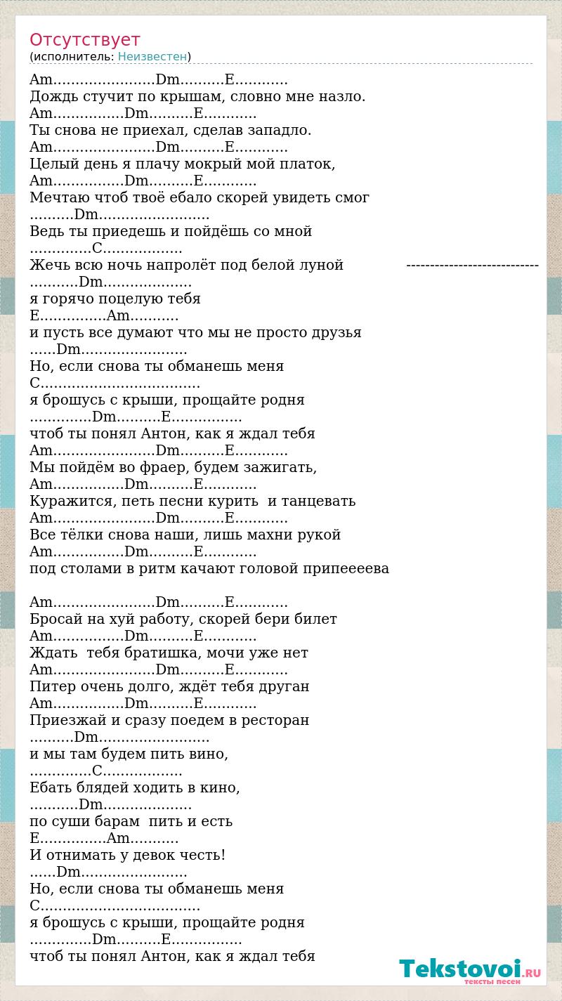 Am.......................Dm..........E............ Дождь стучит по крышам, словно мне назло. Am................Dm..........E............ Ты снова не приехал, сделав западло. Am.......................Dm..........E............ Целый день я плачу мокрый мой платок, Am................Dm..........E............ Мечтаю чтоб твоё ебало скорей увидеть смог ..........Dm......................... Ведь ты приедешь и пойдёшь со мной ..............C.................. Жечь всю ночь напролёт под белой луной ---------------------------- ...........Dm.................... я горячо поцелую тебя E...............Am........... и пусть все думают что мы не просто друзья ......Dm........................ Но, если снова ты обманешь меня C.................................... я брошусь с крыши, прощайте родня ..............Dm..........E................ чтоб ты понял Антон, как я ждал тебя Am.......................Dm..........E............ Мы пойдём во фраер, будем зажигать, Am................Dm..........E............ Куражится, петь песни курить и танцевать Am.......................Dm..........E............ Все тёлки снова наши, лишь махни рукой Am................Dm..........E............ под столами в ритм качают головой припеееева Am.......................Dm..........E............ Бросай на хуй работу, скорей бери билет Am................Dm..........E............ Ждать тебя братишка, мочи уже нет Am.......................Dm..........E............ Питер очень долго, ждёт тебя друган Am................Dm..........E............ Приезжай и сразу поедем в ресторан ..........Dm......................... и мы там будем пить вино, ..............C.................. Ебать блядей ходить в кино, ...........Dm.................... по суши барам пить и есть E...............Am........... И отнимать у девок честь! ......Dm........................ Но, если снова ты обманешь меня C.................................... я брошусь с крыши, прощайте родня ..............Dm..........E................ чтоб ты понял Антон, как я ждал тебя