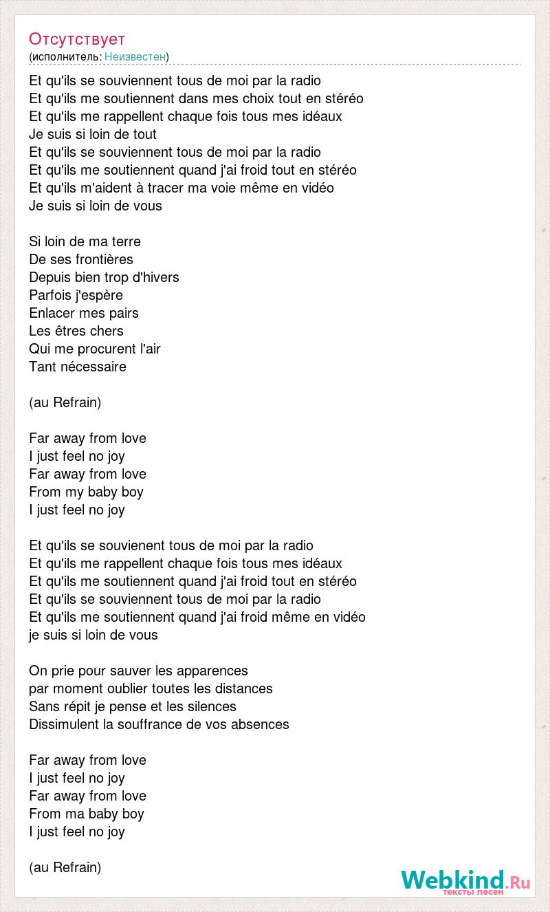 Et qu'ils se souviennent tous de moi par la radio Et qu'ils me soutiennent dans mes choix tout en stéréo Et qu'ils me rappellent chaque fois tous mes idéaux Je suis si loin de tout Et qu'ils se souviennent tous de moi par la radio Et qu'ils me soutiennent quand j'ai froid tout en stéréo Et qu'ils m'aident à tracer ma voie même en vidéo Je suis si loin de vous Si loin de ma terre De ses frontières Depuis bien trop d'hivers Parfois j'espère Enlacer mes pairs Les êtres chers Qui me procurent l'air Tant nécessaire (au Refrain) Far away from love I just feel no joy Far away from love From my baby boy I just feel no joy Et qu'ils se souvienent tous de moi par la radio Et qu'ils me rappellent chaque fois tous mes idéaux Et qu'ils me soutiennent quand j'ai froid tout en stéréo Et qu'ils se souviennent tous de moi par la radio Et qu'ils me soutiennent quand j'ai froid même en vidéo je suis si loin de vous On prie pour sauver les apparences par moment oublier toutes les distances Sans répit je pense et les silences Dissimulent la souffrance de vos absences Far away from love I just feel no joy Far away from love From ma baby boy I just feel no joy (au Refrain)