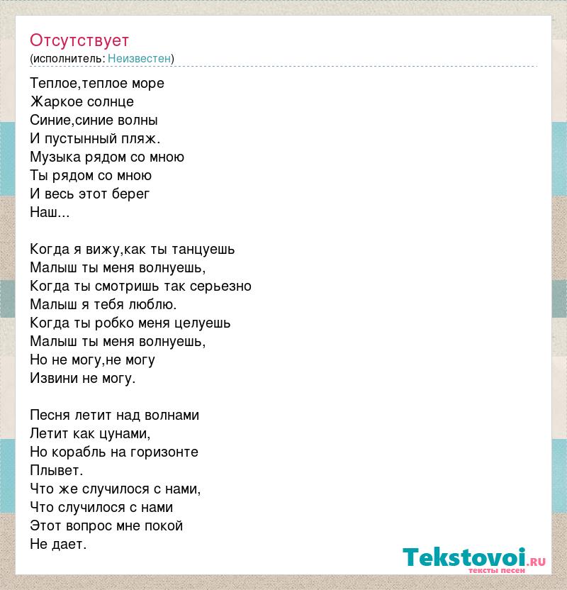 Теплое,теплое море Жаркое солнце Синие,синие волны И пустынный пляж. Музыка рядом со мною Ты рядом со мною И весь этот берег Наш... Когда я вижу,как ты танцуешь Малыш ты меня волнуешь, Когда ты смотришь так серьезно Малыш я тебя люблю. Когда ты робко меня целуешь Малыш ты меня волнуешь, Но не могу,не могу Извини не могу. Песня летит над волнами Летит как цунами, Но корабль на горизонте Плывет. Что же случилося с нами, Что случилося с нами Этот вопрос мне покой Не дает.