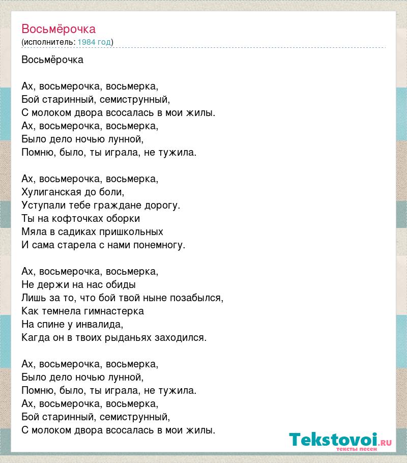 Восьмёрочка Ах, восьмерочка, восьмерка, Бой старинный, семиструнный, С молоком двора всосалась в мои жилы. Ах, восьмерочка, восьмерка, Было дело ночью лунной, Помню, было, ты играла, не тужила. Ах, восьмерочка, восьмерка, Хулиганская до боли, Уступали тебе граждане дорогу. Ты на кофточках оборки Мяла в садиках пришкольных И сама старела с нами понемногу. Ах, восьмерочка, восьмерка, Hе держи на нас обиды Лишь за то, что бой твой ныне позабылся, Как темнела гимнастерка Hа спине у инвалида, Кагда он в твоих рыданьях заходился. Ах, восьмерочка, восьмерка, Было дело ночью лунной, Помню, было, ты играла, не тужила. Ах, восьмерочка, восьмерка, Бой старинный, семиструнный, С молоком двора всосалась в мои жилы.