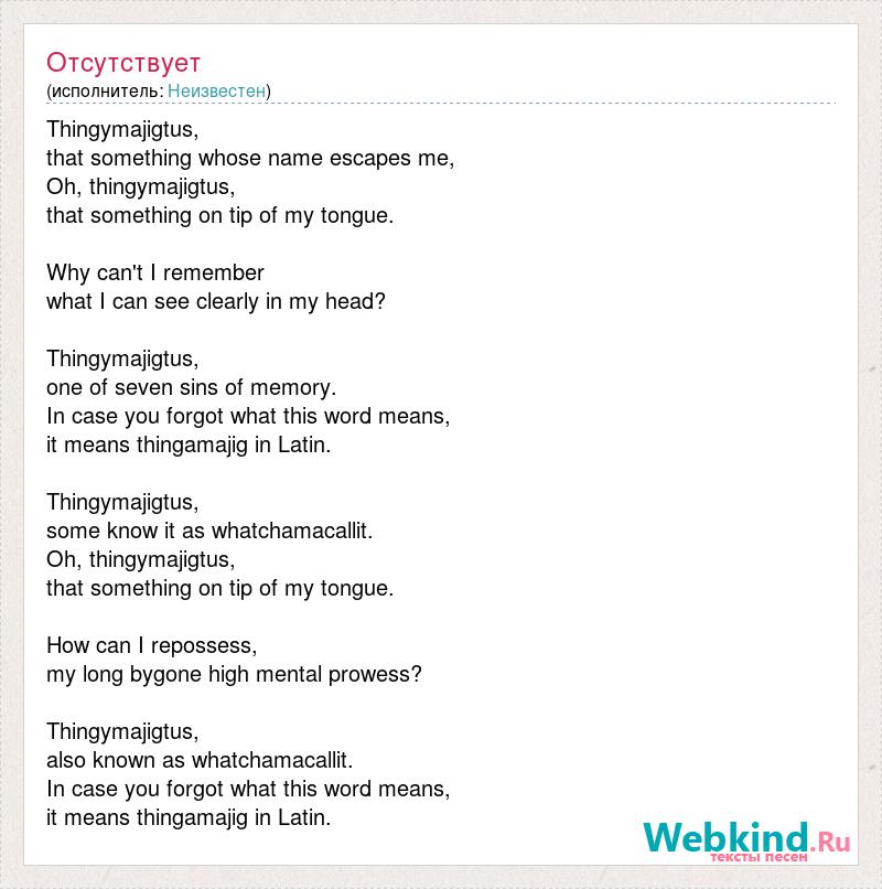 Thingymajigtus, that something whose name escapes me, Oh, thingymajigtus, that something on tip of my tongue. Why can't I remember what I can see clearly in my head? Thingymajigtus, one of seven sins of memory. In case you forgot what this word means, it means thingamajig in Latin. Thingymajigtus, some know it as whatchamacallit. Oh, thingymajigtus, that something on tip of my tongue. How can I repossess, my long bygone high mental prowess? Thingymajigtus, also known as whatchamacallit. In case you forgot what this word means, it means thingamajig in Latin.