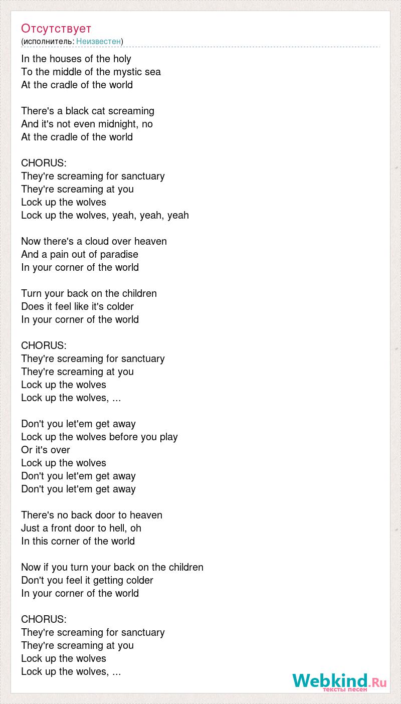 In the houses of the holy To the middle of the mystic sea At the cradle of the world There's a black cat screaming And it's not even midnight, no At the cradle of the world [bad word] They're screaming for sanctuary They're screaming at you Lock up the wolves Lock up the wolves, yeah, yeah, yeah Now there's a cloud over heaven And a pain out of paradise In your corner of the world Turn your back on the children Does it feel like it's colder In your corner of the world [bad word] They're screaming for sanctuary They're screaming at you Lock up the wolves Lock up the wolves, ... Don't you let'em get away Lock up the wolves before you play Or it's over Lock up the wolves Don't you let'em get away Don't you let'em get away There's no back door to heaven Just a front door to [bad word] oh In this corner of the world Now if you turn your back on the children Don't you feel it getting colder In your corner of the world [bad word] They're screaming for sanctuary They're screaming at you Lock up the wolves Lock up the wolves, ...
