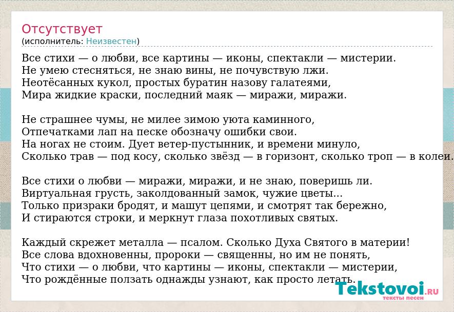 Все стихи — о любви, все картины — иконы, спектакли — мистерии. Не умею стесняться, не знаю вины, не почувствую лжи. Неотёсанных кукол, простых буратин назову галатеями, Мира жидкие краски, последний маяк — миражи, миражи. Не страшнее чумы, не милее зимою уюта каминного, Отпечатками лап на песке обозначу ошибки свои. На ногах не стоим. Дует ветер-пустынник, и времени минуло, Сколько трав — под косу, сколько звёзд — в горизонт, сколько троп — в колеи. Все стихи о любви — миражи, миражи, и не знаю, поверишь ли. Виртуальная грусть, заколдованный замок, чужие цветы... Только призраки бродят, и машут цепями, и смотрят так бережно, И стираются строки, и меркнут глаза похотливых святых. Каждый скрежет металла — псалом. Сколько Духа Святого в материи! Все слова вдохновенны, пророки — священны, но им не понять, Что стихи — о любви, что картины — иконы, спектакли — мистерии, Что рождённые ползать однажды узнают, как просто летать.