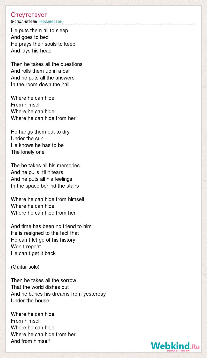 He puts them all to sleep And goes to bed He prays their souls to keep And lays his head Then he takes all the questions And rolls them up in a ball And he puts all the answers In the room down the hall Where he can hide From himself Where he can hide Where he can hide from her He hangs them out to dry Under the sun He knows he has to be The lonely one The he takes all his memories And he pulls til it tears And he puts all his feelings In the space behind the stairs Where he can hide from himself Where he can hide Where he can hide from her And time has been no friend to him He is resigned to the fact that He can t let go of his history Won t repeat, He can t get it back (Guitar solo) Then he takes all the sorrow That the world dishes out And he buries his dreams from yesterday Under the house Where he can hide From himself Where he can hide Where he can hide from her And from himself