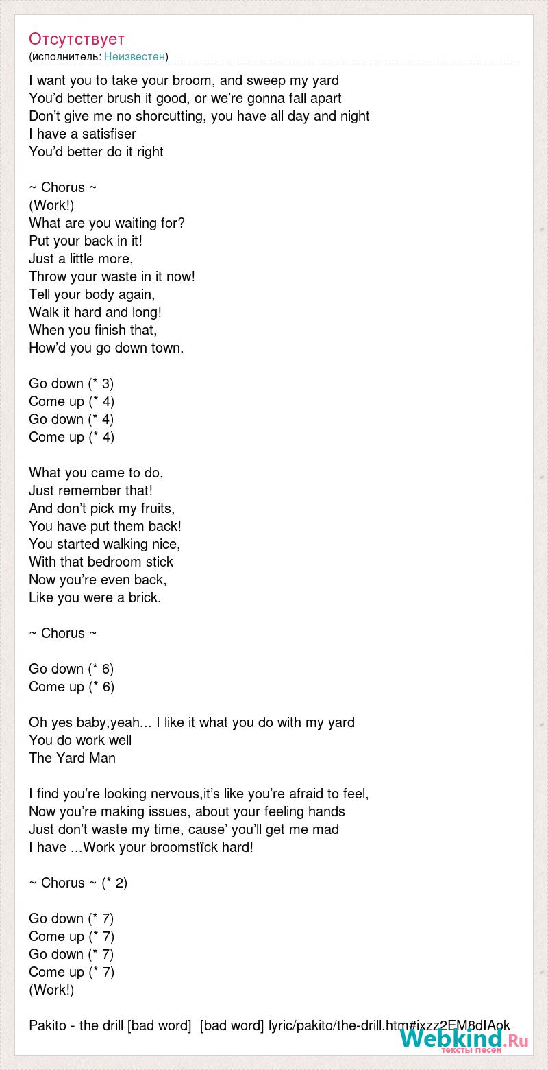 I want you to take your broom, and sweep my yard You’d better [bad word] it good, or we’re gonna fall apart Don’t give me no shorcutting, you have all day and night I have a satisfiser You’d better do it right ~ [bad word] ~ (Work!) What are you waiting for? Put your back in it! Just a little more, Throw your waste in it now! Tell your body again, Walk it hard and long! When you finish that, How’d you go down town. Go down (* 3) [bad word] up (* 4) Go down (* 4) [bad word] up (* 4) What you came to do, Just remember that! And don’t pick my [bad word] You have put them back! You started walking nice, With that bedroom stick Now you’re even back, Like you were a brick. ~ [bad word] ~ Go down (* 6) [bad word] up (* 6) Oh yes baby,yeah... I like it what you do with my yard You do work well The Yard Man I find you’re looking nervous,it’s like you’re afraid to feel, Now you’re making issues, about your feeling hands Just don’t waste my time, cause’ you’ll get me mad I have ...Work your broomstïck hard! ~ [bad word] ~ (* 2) Go down (* 7) [bad word] up (* 7) Go down (* 7) [bad word] up (* 7) (Work!) Pakito - the drill [bad word] [bad word] lyric/pakito/the-drill.htm#ixzz2EM8dIAok