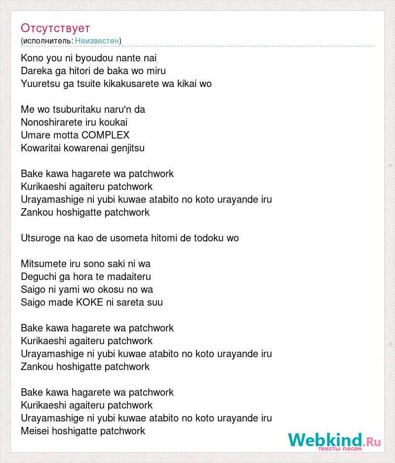 Kono you ni byoudou nante nai Dareka ga hitori de baka wo [bad word] Yuuretsu ga tsuite kikakusarete wa kikai wo Me wo tsuburitaku [bad word] #39;n da Nonoshirarete [bad word] koukai Umare [bad word] Kowaritai kowarenai genjitsu Bake kawa hagarete wa patchwork Kurikaeshi [bad word] patchwork Urayamashige ni yubi kuwae atabito no koto urayande [bad word] Zankou hoshigatte patchwork Utsuroge na kao de usometa hitomi de todoku wo Mitsumete [bad word] sono saki ni wa Deguchi ga hora te [bad word] Saigo ni yami wo okosu no wa Saigo made KOKE ni sareta suu Bake kawa hagarete wa patchwork Kurikaeshi [bad word] patchwork Urayamashige ni yubi kuwae atabito no koto urayande [bad word] Zankou hoshigatte patchwork Bake kawa hagarete wa patchwork Kurikaeshi [bad word] patchwork Urayamashige ni yubi kuwae atabito no koto urayande [bad word] Meisei hoshigatte patchwork
