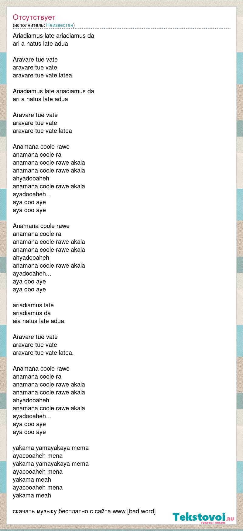 Ariadiamus late ariadiamus da ari a natus late adua Aravare tue vate aravare tue vate aravare tue vate latea Ariadiamus late ariadiamus da ari a natus late adua Aravare tue vate aravare tue vate aravare tue vate latea Anamana coole rawe anamana coole ra anamana coole rawe akala anamana coole rawe akala ahyadooaheh anamana coole rawe akala ayadooaheh... aya doo aye aya doo aye Anamana coole rawe anamana coole ra anamana coole rawe akala anamana coole rawe akala ahyadooaheh anamana coole rawe akala ayadooaheh... aya doo aye aya doo aye ariadiamus late ariadiamus da aia natus late adua. Aravare tue vate aravare tue vate aravare tue vate latea. Anamana coole rawe anamana coole ra anamana coole rawe akala anamana coole rawe akala ahyadooaheh anamana coole rawe akala ayadooaheh... aya doo aye aya doo aye yakama yamayakaya mema ayacooaheh mena yakama yamayakaya mema ayacooaheh mena yakama meah ayacooaheh mena yakama meah скачать музыку бесплатно с сайта www [bad word]