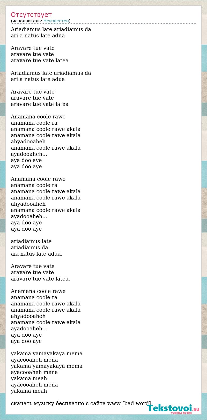 Ariadiamus late ariadiamus da ari a natus late adua Aravare tue vate aravare tue vate aravare tue vate latea Ariadiamus late ariadiamus da ari a natus late adua Aravare tue vate aravare tue vate aravare tue vate latea Anamana coole rawe anamana coole ra anamana coole rawe akala anamana coole rawe akala ahyadooaheh anamana coole rawe akala ayadooaheh... aya doo aye aya doo aye Anamana coole rawe anamana coole ra anamana coole rawe akala anamana coole rawe akala ahyadooaheh anamana coole rawe akala ayadooaheh... aya doo aye aya doo aye ariadiamus late ariadiamus da aia natus late adua. Aravare tue vate aravare tue vate aravare tue vate latea. Anamana coole rawe anamana coole ra anamana coole rawe akala anamana coole rawe akala ahyadooaheh anamana coole rawe akala ayadooaheh... aya doo aye aya doo aye yakama yamayakaya mema ayacooaheh mena yakama yamayakaya mema ayacooaheh mena yakama meah ayacooaheh mena yakama meah скачать музыку бесплатно с сайта www [bad word]