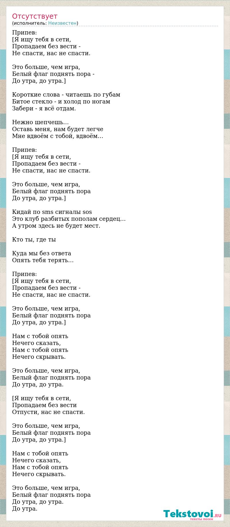 Припев: [Я ищу тебя в сети, Пропадаем без вести - Не спасти, нас не спасти. Это больше, чем игра, Белый флаг поднять пора - До утра, до утра.] Короткие слова - читаешь по губам Битое стекло - и холод по ногам Забери - я всё отдам. Нежно шепчешь… Оставь меня, нам будет легче Мне вдвоём с тобой, вдвоём… Припев: [Я ищу тебя в сети, Пропадаем без вести - Не спасти, нас не спасти. Это больше, чем игра, Белый флаг поднять пора До утра, до утра.] Кидай по sms сигналы sos Это клуб разбитых пополам сердец… А утром здесь не будет мест. Кто ты, где ты Куда мы без ответа Опять тебя терять… Припев: [Я ищу тебя в сети, Пропадаем без вести - Не спасти, нас не спасти. Это больше, чем игра, Белый флаг поднять пора До утра, до утра.] Нам с тобой опять Нечего сказать, Нам с тобой опять Нечего скрывать. Это больше, чем игра, Белый флаг поднять пора До утра, до утра. [Я ищу тебя в сети, Пропадаем без вести Отпусти, нас не спасти. Это больше, чем игра, Белый флаг поднять пора До утра, до утра.] Нам с тобой опять Нечего сказать, Нам с тобой опять Нечего скрывать. Это больше, чем игра, Белый флаг поднять пора До утра, до утра. До утра.