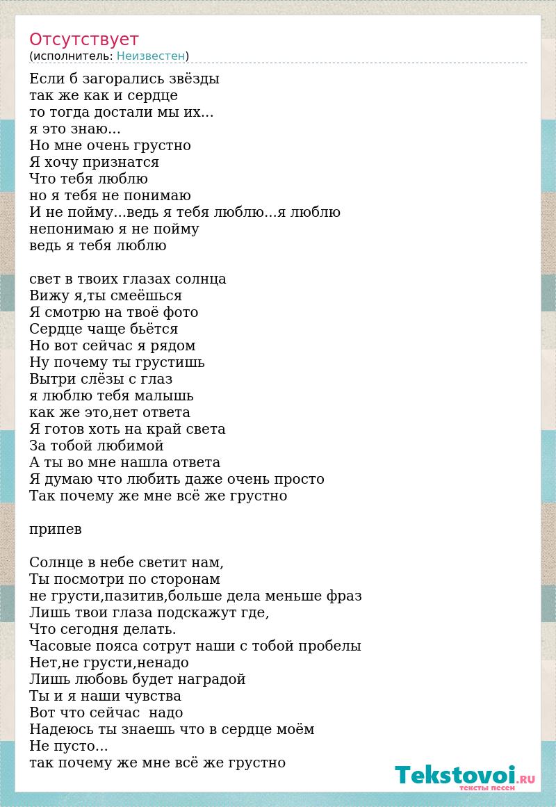 Если б загорались звёзды так же как и сердце то тогда достали мы их... я это знаю... Но мне очень грустно Я хочу признатся Что тебя люблю но я тебя не понимаю И не пойму...ведь я тебя люблю...я люблю непонимаю я не пойму ведь я тебя люблю свет в твоих глазах солнца Вижу я,ты смеёшься Я смотрю на твоё фото Сердце чаще бьётся Но вот сейчас я рядом Ну почему ты грустишь Вытри слёзы с глаз я люблю тебя малышь как же это,нет ответа Я готов хоть на край света За тобой любимой А ты во мне нашла ответа Я думаю что любить даже очень просто Так почему же мне всё же грустно припев Солнце в небе светит нам, Ты посмотри по сторонам не грусти,пазитив,больше дела меньше фраз Лишь твои глаза подскажут где, Что сегодня делать. Часовые пояса сотрут наши с тобой пробелы Нет,не грусти,ненадо Лишь любовь будет наградой Ты и я наши чувства Вот что сейчас надо Надеюсь ты знаешь что в сердце моём Не пусто... так почему же мне всё же грустно