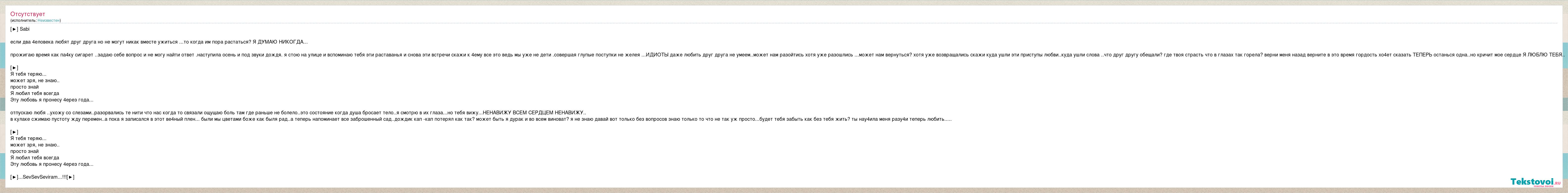 прожигаю время как па4ку сигарет ..задаю себе вопрос и не могу найти ответ .наступила осень и под звуки дождя. я стою на улице и вспоминаю тебя эти раставанья и снова эти встречи скажи к 4ему все это ведь мы уже не дети .совершая глупые поступки не желея ...ИДИОТЫ даже любить друг друга не умеем..может нам разойтись хотя уже разошлись ...может нам вернуться? хотя уже возвращались скажи куда ушли эти приступы любви..куда ушли слова ..что друг другу обещали? где твоя страсть что в глазах так горела? верни меня назад верните в это время гордость хо4ет сказать ТЕПЕРЬ останься одна..но кричит мое сердце Я ЛЮБЛЮ ТЕБЯ..