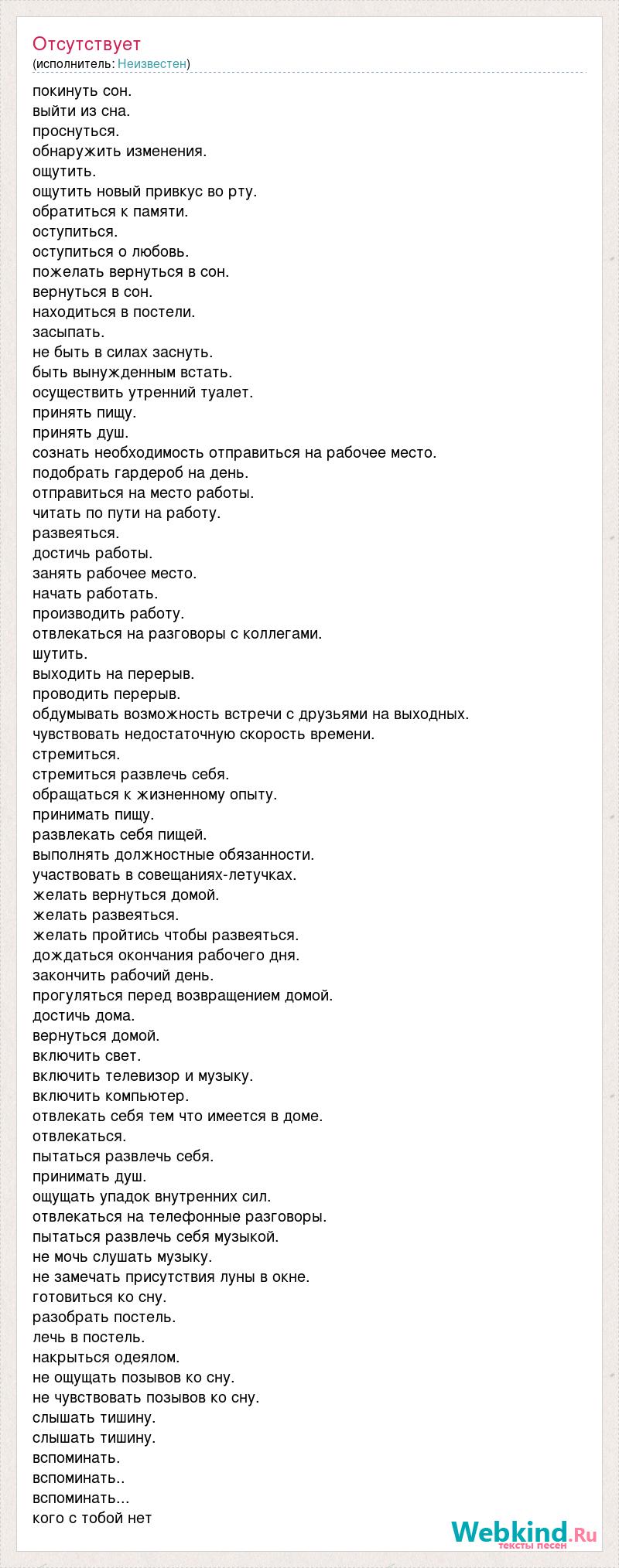 покинуть сон. выйти из сна. проснуться. обнаружить изменения. ощутить. ощутить новый привкус во рту. обратиться к памяти. оступиться. оступиться о любовь. пожелать вернуться в сон. вернуться в сон. находиться в постели. засыпать. не быть в силах заснуть. быть вынужденным встать. осуществить утренний туалет. принять пищу. принять душ. сознать необходимость отправиться на рабочее место. подобрать гардероб на день. отправиться на место работы. читать по пути на работу. развеяться. достичь работы. занять рабочее место. начать работать. производить работу. отвлекаться на разговоры с коллегами. шутить. выходить на перерыв. проводить перерыв. обдумывать возможность встречи с друзьями на выходных. чувствовать недостаточную скорость времени. стремиться. стремиться развлечь себя. обращаться к жизненному опыту. принимать пищу. развлекать себя пищей. выполнять должностные обязанности. участвовать в совещаниях-летучках. желать вернуться домой. желать развеяться. желать пройтись чтобы развеяться. дождаться окончания рабочего дня. закончить рабочий день. прогуляться перед возвращением домой. достичь дома. вернуться домой. включить свет. включить телевизор и музыку. включить компьютер. отвлекать себя тем что имеется в доме. отвлекаться. пытаться развлечь себя. принимать душ. ощущать упадок внутренних сил. отвлекаться на телефонные разговоры. пытаться развлечь себя музыкой. не мочь слушать музыку. не замечать присутствия луны в окне. готовиться ко сну. разобрать постель. лечь в постель. накрыться одеялом. не ощущать позывов ко сну. не чувствовать позывов ко сну. слышать тишину. слышать тишину. вспоминать. вспоминать.. вспоминать... кого с тобой нет