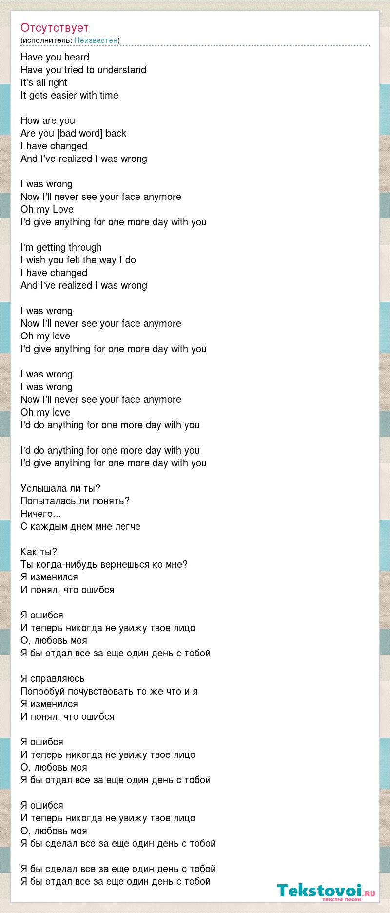Have you heard Have you tried to understand It's all right It gets easier with time How are you Are you [bad word] back I have changed And I've realized I was wrong I was wrong Now I'll never see your face anymore Oh my Love I'd give anything for one more day with you I'm getting through I wish you felt the way I do I have changed And I've realized I was wrong I was wrong Now I'll never see your face anymore Oh my love I'd give anything for one more day with you I was wrong I was wrong Now I'll never see your face anymore Oh my love I'd do anything for one more day with you I'd do anything for one more day with you I'd give anything for one more day with you Услышала ли ты? Попыталась ли понять? Ничего... С каждым днем мне легче Как ты? Ты когда-нибудь вернешься ко мне? Я изменился И понял, что ошибся Я ошибся И теперь никогда не увижу твое лицо О, любовь моя Я бы отдал все за еще один день с тобой Я справляюсь Попробуй почувствовать то же что и я Я изменился И понял, что ошибся Я ошибся И теперь никогда не увижу твое лицо О, любовь моя Я бы отдал все за еще один день с тобой Я ошибся И теперь никогда не увижу твое лицо О, любовь моя Я бы сделал все за еще один день с тобой Я бы сделал все за еще один день с тобой Я бы отдал все за еще один день с тобой