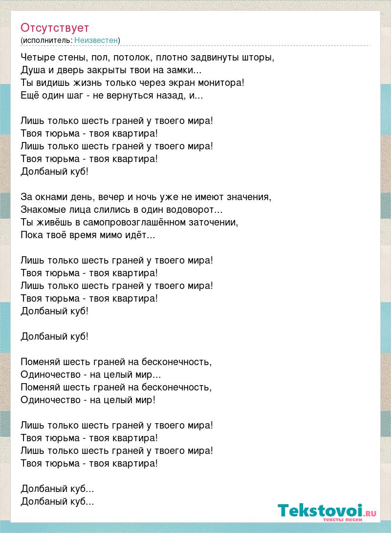 Четыре стены, пол, потолок, плотно задвинуты шторы, Душа и дверь закрыты твои на замки... Ты видишь жизнь только через экран монитора! Ещё один шаг - не вернуться назад, и... Лишь только шесть граней у твоего мира! Твоя тюрьма - твоя квартира! Лишь только шесть граней у твоего мира! Твоя тюрьма - твоя квартира! Долбаный куб! За окнами день, вечер и ночь уже не имеют значения, Знакомые лица слились в один водоворот... Ты живёшь в самопровозглашённом заточении, Пока твоё время мимо идёт... Лишь только шесть граней у твоего мира! Твоя тюрьма - твоя квартира! Лишь только шесть граней у твоего мира! Твоя тюрьма - твоя квартира! Долбаный куб! Долбаный куб! Поменяй шесть граней на бесконечность, Одиночество - на целый мир... Поменяй шесть граней на бесконечность, Одиночество - на целый мир! Лишь только шесть граней у твоего мира! Твоя тюрьма - твоя квартира! Лишь только шесть граней у твоего мира! Твоя тюрьма - твоя квартира! Долбаный куб... Долбаный куб...