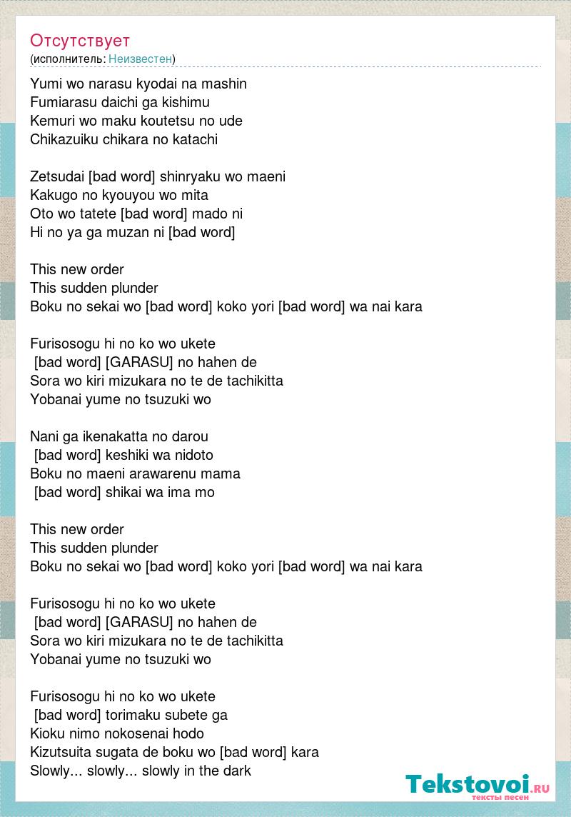 Yumi wo narasu kyodai na mashin Fumiarasu daichi ga kishimu Kemuri wo maku koutetsu no ude Chikazuiku chikara no katachi Zetsudai [bad word] shinryaku wo maeni Kakugo no kyouyou wo mita Oto wo tatete [bad word] mado ni Hi no ya ga muzan ni [bad word] This new order This sudden plunder Boku no sekai wo [bad word] koko yori [bad word] wa nai kara Furisosogu hi no ko wo ukete [bad word] [GARASU] no hahen de Sora wo kiri mizukara no te de tachikitta Yobanai yume no tsuzuki wo Nani ga ikenakatta no darou [bad word] keshiki wa nidoto Boku no maeni arawarenu mama [bad word] shikai wa ima mo This new order This sudden plunder Boku no sekai wo [bad word] koko yori [bad word] wa nai kara Furisosogu hi no ko wo ukete [bad word] [GARASU] no hahen de Sora wo kiri mizukara no te de tachikitta Yobanai yume no tsuzuki wo Furisosogu hi no ko wo ukete [bad word] torimaku subete ga Kioku nimo nokosenai hodo Kizutsuita sugata de boku wo [bad word] kara Slowly... slowly... slowly in the dark