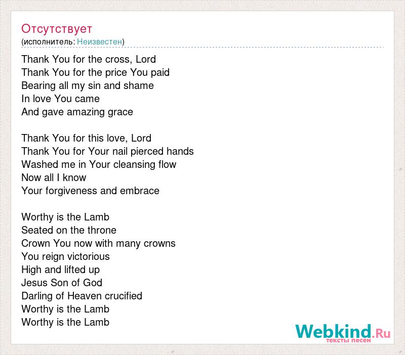Thank You for the cross, Lord Thank You for the price You paid Bearing all my sin and shame In love You came And gave amazing grace Thank You for this love, Lord Thank You for Your nail pierced hands Washed me in Your cleansing flow Now all I know Your forgiveness and embrace Worthy is the Lamb Seated on the throne Crown You now with many crowns You reign victorious High and lifted up Jesus Son of God Darling of Heaven [bad word] Worthy is the Lamb Worthy is the Lamb