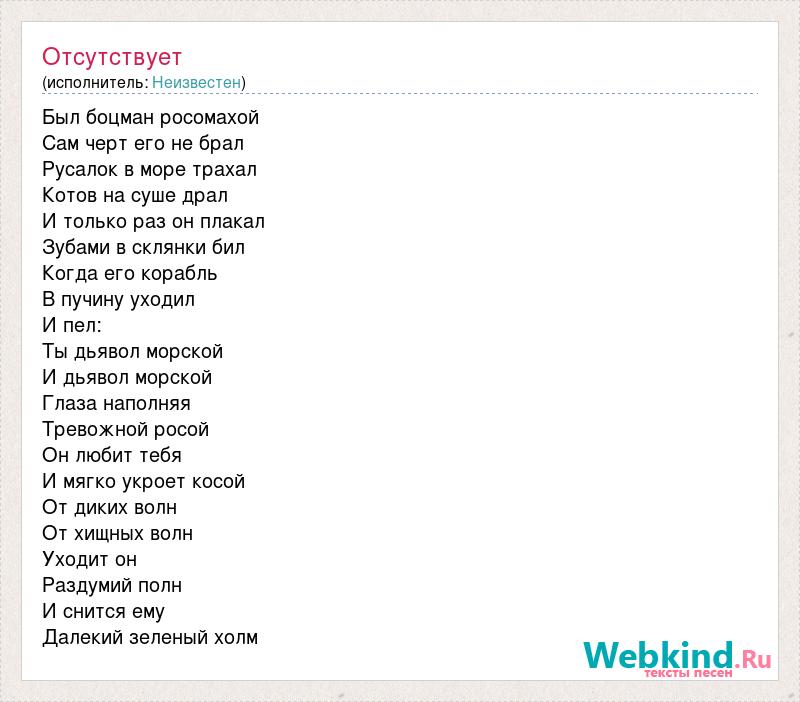 Был боцман росомахой Сам черт его не брал Русалок в море трахал Котов на суше драл И только раз он плакал Зубами в склянки бил Когда его корабль В пучину уходил И пел: Ты дьявол морской И дьявол морской Глаза наполняя Тревожной росой Он любит тебя И мягко укроет косой От диких волн От хищных волн Уходит он Раздумий полн И снится ему Далекий зеленый холм