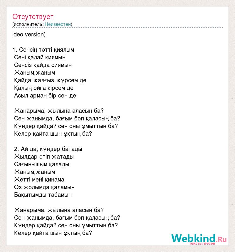 ideo version) 1. Сенсің тәтті қиялым Сені қалай қиямын Сенсіз қайда сиямын Жаным,жаным Қайда жалғыз жүрсем де Қалың ойға кірсем де Асыл арман бір сен де Жанарыма, жылына аласың ба? Сен жанымда, бағым боп қаласың ба? Күндер қайда? сен оны ұмыттың ба? Келер қайта шын ұқтың ба? 2. Ай да, күндер батады Жылдар өтіп жатады Сағынышым қалады Жаным,жаным Жетті мені қинама Оз жолымда қаламын Бақытымды табамын Жанарыма, жылына аласың ба? Сен жанымда, бағым боп қаласың ба? Күндер қайда? сен оны ұмыттың ба? Келер қайта шын ұқтың ба?