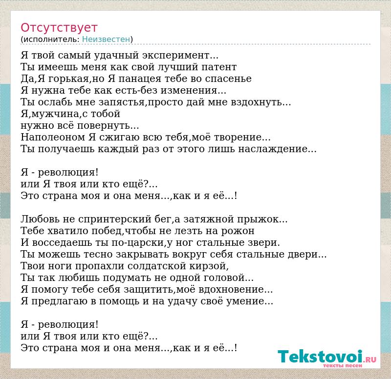 Я твой самый удачный эксперимент... Ты имеешь меня как свой лучший патент Да,Я горькая,но Я панацея тебе во спасенье Я нужна тебе как есть-без изменения... Ты ослабь мне запястья,просто дай мне вздохнуть... Я,мужчина,с тобой нужно всё повернуть... Наполеоном Я сжигаю всю тебя,моё творение... Ты получаешь каждый раз от этого лишь наслаждение... Я - революция! или Я твоя или кто ещё?... Это страна моя и она меня...,как и я её...! Любовь не спринтерский бег,а затяжной прыжок... Тебе хватило побед,чтобы не лезть на рожон И восседаешь ты по-царски,у ног стальные звери. Ты можешь тесно закрывать вокруг себя стальные двери... Твои ноги пропахли солдатской кирзой, Ты так любишь подумать не одной головой... Я помогу тебе себя защитить,моё вдохновение... Я предлагаю в помощь и на удачу своё умение... Я - революция! или Я твоя или кто ещё?... Это страна моя и она меня...,как и я её...!