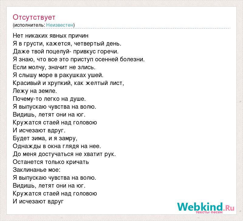 Нет никаких явных причин Я в грусти, кажется, четвертый день. Даже твой поцелуй- привкус горечи. Я знаю, что все это приступ осенней болезни. Если молчу, значит не злись. Я слышу море в ракушках ушей. Красивый и хрупкий, как желтый лист, Лежу на земле. Почему-то легко на душе. Я выпускаю чувства на волю. Видишь, летят они на юг. Кружатся стаей над головою И исчезают вдруг. Будет зима, и я замру, Однажды в окна глядя на нее. До меня достучаться не хватит рук. Останется только кричать Заклинанье мое: Я выпускаю чувства на волю. Видишь, летят они на юг. Кружатся стаей над головою И исчезают вдруг