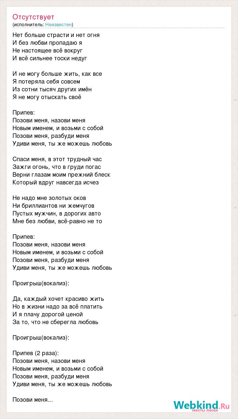 Нет больше страсти и нет огня И без любви пропадаю я Не настоящее всё вокруг И всё сильнее тоски недуг И не могу больше жить, как все Я потеряла себя совсем Из сотни тысяч других имён Я не могу отыскать своё Припев: Позови меня, назови меня Новым именем, и возьми с собой Позови меня, разбуди меня Удиви меня, ты же можешь любовь Спаси меня, в этот трудный час Зажги огонь, что в груди погас Верни глазам моим прежний блеск Который вдруг навсегда исчез Не надо мне золотых оков Ни бриллиантов ни жемчугов Пустых мужчин, в дорогих авто Мне без любви, всё-равно не то Припев: Позови меня, назови меня Новым именем, и возьми с собой Позови меня, разбуди меня Удиви меня, ты же можешь любовь Проигрыш(вокализ): Да, каждый хочет красиво жить Но в жизни надо за всё платить И я плачу дорогой ценой За то, что не сберегла любовь Проигрыш(вокализ): Припев (2 раза): Позови меня, назови меня Новым именем, и возьми с собой Позови меня, разбуди меня Удиви меня, ты же можешь любовь Позови меня...