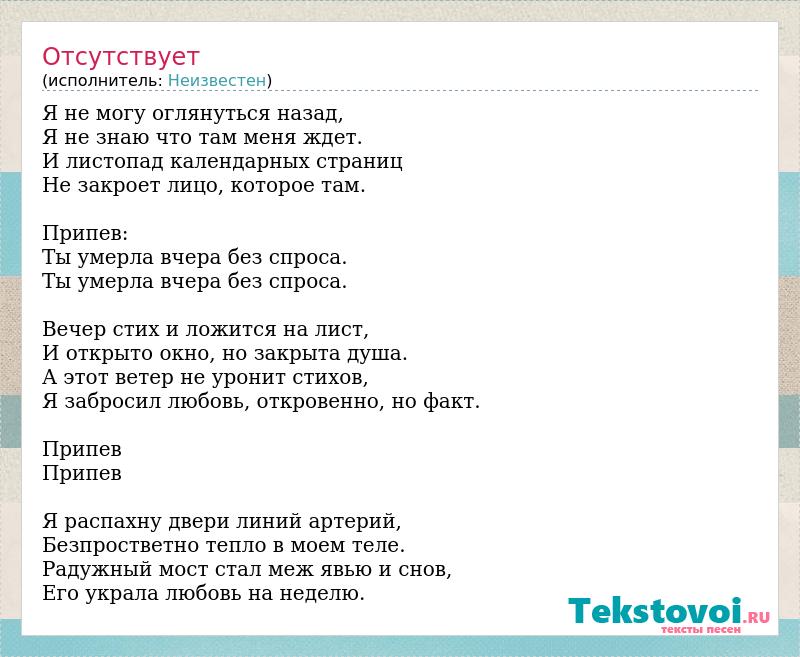 Я не могу оглянуться назад, Я не знаю что там меня ждет. И листопад календарных страниц Не закроет лицо, которое там. Припев: Ты умерла вчера без спроса. Ты умерла вчера без спроса. Вечер стих и ложится на лист, И открыто окно, но закрыта душа. А этот ветер не уронит стихов, Я забросил любовь, откровенно, но факт. Припев Припев Я распахну двери линий артерий, Безпростветно тепло в моем теле. Радужный мост стал меж явью и снов, Его украла любовь на неделю.