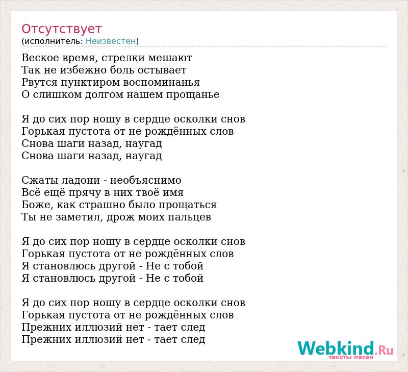 Веское время, стрелки мешают Так не избежно боль остывает Рвутся пунктиром воспоминанья О слишком долгом нашем прощанье Я до сих пор ношу в сердце осколки снов Горькая пустота от не рождённых слов Снова шаги назад, наугад Снова шаги назад, наугад Сжаты ладони - необъяснимо Всё ещё прячу в них твоё имя Боже, как страшно было прощаться Ты не заметил, дрож моих пальцев Я до сих пор ношу в сердце осколки снов Горькая пустота от не рождённых слов Я становлюсь другой - Не с тобой Я становлюсь другой - Не с тобой Я до сих пор ношу в сердце осколки снов Горькая пустота от не рождённых слов Прежних иллюзий нет - тает след Прежних иллюзий нет - тает след