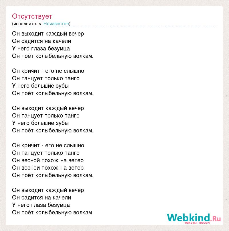Он выходит каждый вечер Он садится на качели У него глаза безумца Он поёт колыбельную волкам. Он кричит - его не слышно Он танцует только танго У него большие зубы Он поёт колыбельную волкам. Он выходит каждый вечер Он танцует только танго У него большие зубы Он поёт колыбельную волкам. Он кричит - его не слышно Он танцует только танго Он весной похож на ветер Он весной похож на ветер Он поёт колыбельную волкам. Он выходит каждый вечер Он садится на качели У него глаза безумца Он поёт колыбельную волкам