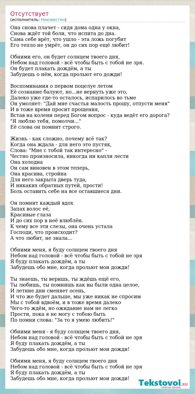 Она снова плачет - сидя дома одна у окна, Снова ждёт той боли, что испита до дна. Сама себе врёт, что ушло - эта ложь погубит Его тепло не умрёт, он до сих пор ещё любит! Обними его, он будет солнцем твоего дня, Небом над головой - всё чтобы быть с тобой не зря. Он будет плакать дождём, а ты Забудешь о нём, когда прольют его дожди! Воспоминания о первом поцелуе летом Её сознание балуют, но...не вернуть уже это, Далеко уже где-то осталось, испарилось во тьме Он умоляет: "Дай мне счастья малость прошу, отпусти меня" И в тоже время просит прощения, Встав на колени перед Богом вопрос - куда ведёт его дорога? "Я люблю тебя, помолчи..." Её слова он помнит строго. Жизнь - как сложно, почему всё так? Когда она ждала - для него это пустяк, Слова: "Мне с тобой так интересно" - Честно произносила, никогда ни капли лести Она холодна Он сам виновен в этом теперь, Она красива, стройна Для него закрыта дверь туда, И никаких обратных путей, прости! Боль оставить себе на все оставшиеся дни. Он помнит каждый вдох Запах волос её, Красивые глаза И до сих пор в неё влюблён. К чему все эти слезы, она очень устала Господи, что происходит? А что любит, не знала... Обними меня, я буду солнцем твоего дня Небом над головой - всё чтобы быть с тобой не зря Я буду плакать дождём, а ты Забудешь обо мне, когда прольют мои дожди! Ты знаешь, ты веришь, ты ждёшь ещё его, Ты любишь, ты помнишь как вы были одна целое, И летние дни сменяет осень, И что же будет дальше, мы уже никак не спросим Мы с тобой вдвоём, и в тоже время далеко Чего-то ждём, но ожидание нам не легко Прости, пока я не могу с тобою быть По помни слова: "За то я умею любить!" Обними меня - я буду солнцем твоего дня, Небом над головой - всё чтобы быть с тобой не зря Я буду плакать дождём, а ты Забудешь обо мне, когда прольют мои дожди! Обними меня, я буду солнцем твоего дня Небом над головой - всё чтобы быть с тобой не зря Я буду плакать дождём, а ты Забудешь обо мне, когда прольют мои дожди!