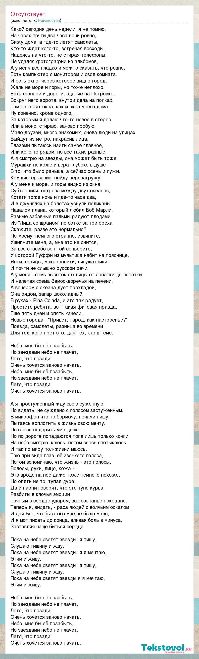 Какой сегодня день недели, я не помню, На часах почти два часа ночи ровно, Сижу дома, а где-то летят самолеты, Кто-то ждет кого-то, встречая восходы. Надеясь на что-то, не стирая телефоны, Не удаляя фотографии из альбомов, А у меня все гладко и можно сказать, что ровно, Есть компьютер с монитором и своя комната. И есть окно, через которое видно город, Жаль не море и горы, но тоже неплохо. Есть фонари и дороги, здание на Петровке, Вокруг него ворота, внутри дела на полках. Там не горят окна, как и окна моего дома, Ну конечно, кроме одного, За которым я делаю что-то новое в стерео Или в моно, стираю, заново пробую. Мало друзей, много знакомых, снова люди на улицах Выйдут из метро, накрасив лица, Глазами пытаюсь найти самое главное, Или кого-то рядом, но все такие разные. А я смотрю на звезды, она может быть тоже, Мурашки по коже и вера глубоко в душе В то, что было раньше, а сейчас осень и лужи. Компьютер завис, пойду перезагружу. А у меня и море, и горы видно из окна, Субтропики, острова между двух океанов, Кстати тоже ночь и где-то часа два, И в джунглях на болотах уснули пеликаны. Навалом плана, который любил Боб Марли, Разные забавные пальмы радуют плодами Из "Лица со шрамом" по сотке за три ореха Скажите, разве это нормально? По-моему, немного странно, извините, Ущипните меня, а, мне это не снится, За все спасибо вон той сеньорите, У которой Гуффи из мультика набит на пояснице. Янки, фрицы, макаронники, лягушатники, И почти не слышно русской речи, А у меня - семь высоток столицы от лопатки до лопатки И нелепая схема Замоскворечья на печени. А вечером с океана дует прохладой, Она рядом, загар шоколадный, В руках - Pina Colada, и это так радует, Простите ребята, вот такая фиговая правда. Еще пять дней и опять качели, Новые города - "Привет, народ, как настроенье?" Поезда, самолеты, разница во времени Для тех, кого прёт это, для тех, кто в теме. Небо, мне бы её позабыть, Но звездами небо не плачет, Лето, что позади, Очень хочется заново начать. Небо, мне бы её позабыть, Но звездами небо не плачет, Лето, что позади, Очень хочется заново начать. А я простуженный жду свою суженную, Но видать, не суждено с голосом застуженным. В микрофон что-то бормочу, ночами пишу, Пытаясь воплотить в жизнь свою мечту. Пытаюсь подарить мир дочке, Но по дороге попадаются пока лишь только кочки. На небо смотрю, каюсь, потом вновь спотыкаюсь, И так по миру пол-жизни маюсь. Таю при виде глаз, её звонкого голоса, Потом вспоминаю, что жизнь - это полосы, Волосы, руки, лицо, кожа - Это вроде на неё даже тоже немного похоже. Но опять не то, тупая дура, Да и парни говорят, что это тупо курва. Разбиты в клочья эмоции Точным в сердце ударом, все сознанье покоцано. Теперь я, видать, - раса людей с волчьим оскалом И дай Бог, чтобы этого мне не было мало, И я мог писать до конца, вливая боль в минуса, Заставляя чаще биться сердца. Пока на небе светят звезды, я пишу, Слушаю тишину и жду. Пока на небе светят звезды, я я мечтаю, Этим и живу. Пока на небе светят звезды, я пишу, Слушаю тишину и жду. Пока на небе светят звезды я я мечтаю, Этим и живу. Небо, мне бы её позабыть, Но звездами небо не плачет, Лето, что позади, Очень хочется заново начать. Небо, мне бы её позабыть, Но звездами небо не плачет, Лето, что позади, Очень хочется заново начать.