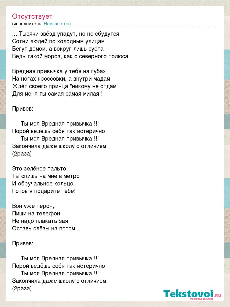 ....Тысячи звёзд упадут, но не сбудутся Сотни людей по холодным улицам Бегут домой, а вокруг лишь суета Ведь такой мороз, как с северного полюса Вредная привычка у тебя на губах На ногах кроссовки, а внутри мадам Ждёт своего принца "никому не отдам" Для меня ты самая самая милая ! Привев: Ты моя Вредная привычка !!! Порой ведёшь себя так истерично Ты моя Вредная привычка !!! Закончила даже школу с отличием (2раза) Это зелёное пальто Ты спишь на мне в метро И обручальное кольцо Готов я подарите тебе! Вон уже перон, Пиши на телефон Не надо плакать зая Оставь слёзы на потом... Привев: Ты моя Вредная привычка !!! Порой ведёшь себя так истерично Ты моя Вредная привычка !!! Закончила даже школу с отличием (2раза)