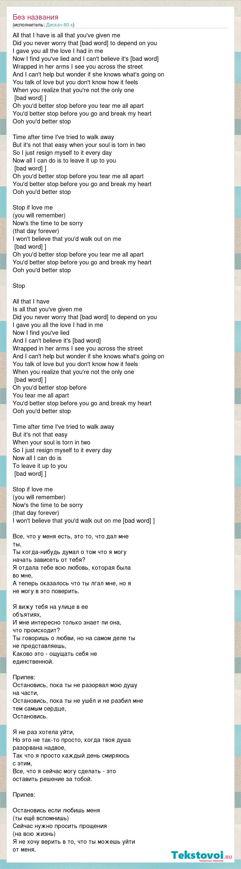 All that I have is all that you've given me Did you never worry that [bad word] to depend on you I gave you all the love I had in me Now I find you've lied and I can't believe it's [bad word] Wrapped in her arms I see you across the street And I can't help but wonder if she knows what's going on You talk of love but you don't know how it feels When you realize that you're not the only one [bad word] ] Oh you'd better stop before you tear me all apart You'd better stop before you go and break my heart Ooh you'd better stop Time after time I've tried to walk away But it's not that easy when your soul is torn in two So I just resign myself to it every day Now all I can do is to leave it up to you [bad word] ] Oh you'd better stop before you tear me all apart You'd better stop before you go and break my heart Ooh you'd better stop Stop if love me (you will remember) Now's the time to be sorry (that day forever) I won't believe that you'd walk out on me [bad word] ] Oh you'd better stop before you tear me all apart You'd better stop before you go and break my heart Ooh you'd better stop Stop All that I have Is all that you've given me Did you never worry that [bad word] to depend on you I gave you all the love I had in me Now I find you've lied And I can't believe it's [bad word] Wrapped in her arms I see you across the street And I can't help but wonder if she knows what's going on You talk of love but you don't know how it feels When you realize that you're not the only one [bad word] ] Oh you'd better stop before You tear me all apart You'd better stop before you go and break my heart Ooh you'd better stop Time after time I've tried to walk away But it's not that easy When your soul is torn in two So I just resign myself to it every day Now all I can do is To leave it up to you [bad word] ] Stop if love me (you will remember) Now's the time to be sorry (that day forever) I won't believe that you'd walk out on me [bad word] ] Все, что у меня есть, это то, что дал мне ты, Ты когда-нибудь думал о том что я могу начать зависеть от тебя? Я отдала тебе всю любовь, которая была во мне, А теперь оказалось что ты лгал мне, но я не могу в это поверить. Я вижу тебя на улице в ее объятиях, И мне интересно только знает ли она, что происходит? Ты говоришь о любви, но на самом деле ты не представляешь, Каково это - ощущать себя не единственной. Припев: Остановись, пока ты не разорвал мою душу на части, Остановись, пока ты не ушёл и не разбил мне тем самым сердце, Остановись. Я не раз хотела уйти, Но это не так-то просто, когда твоя душа разорвана надвое, Так что я просто каждый день смиряюсь с этим, Все, что я сейчас могу сделать - это оставить решение за тобой. Припев: Остановись если любишь меня (ты ещё вспомнишь) Сейчас нужно просить прощения (на всю жизнь) Я не хочу верить в то, что ты можешь уйти от меня.