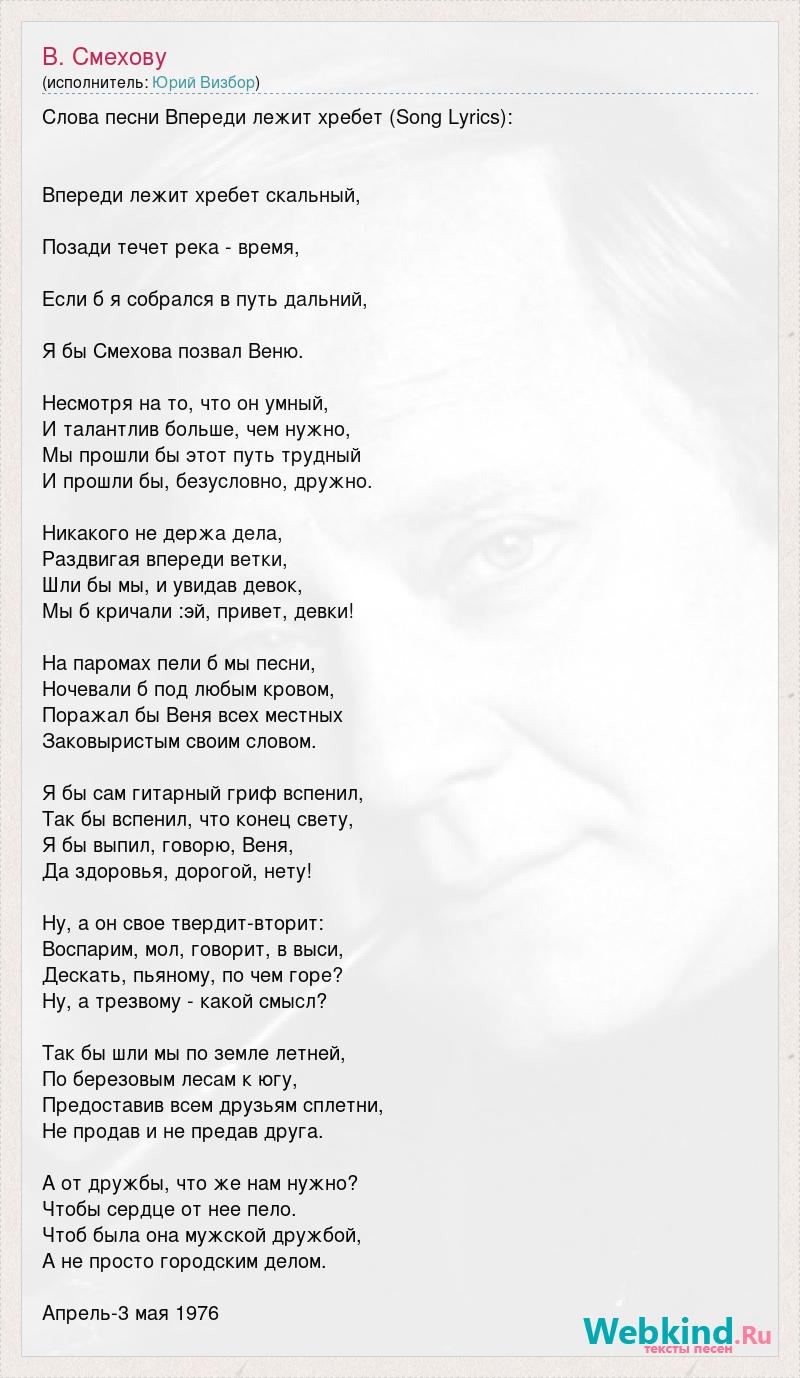 Слова песни Впереди лежит хребет (Song Lyrics): Впереди лежит хребет скальный, Позади течет река - время, Если б я собрался в путь дальний, Я бы Смехова позвал Веню. Несмотря на то, что он умный, И талантлив больше, чем нужно, Мы прошли бы этот путь трудный И прошли бы, безусловно, дружно. Никакого не держа дела, Раздвигая впереди ветки, Шли бы мы, и увидав девок, Мы б кричали :эй, привет, девки! На паромах пели б мы песни, Ночевали б под любым кровом, Поражал бы Веня всех местных Заковыристым своим словом. Я бы сам гитарный гриф вспенил, Так бы вспенил, что конец свету, Я бы выпил, говорю, Веня, Да здоровья, дорогой, нету! Ну, а он свое твердит-вторит: Воспарим, мол, говорит, в выси, Дескать, пьяному, по чем горе? Ну, а трезвому - какой смысл? Так бы шли мы по земле летней, По березовым лесам к югу, Предоставив всем друзьям сплетни, Не продав и не предав друга. А от дружбы, что же нам нужно? Чтобы сердце от нее пело. Чтоб была она мужской дружбой, А не просто городским делом. Апрель-3 мая 1976