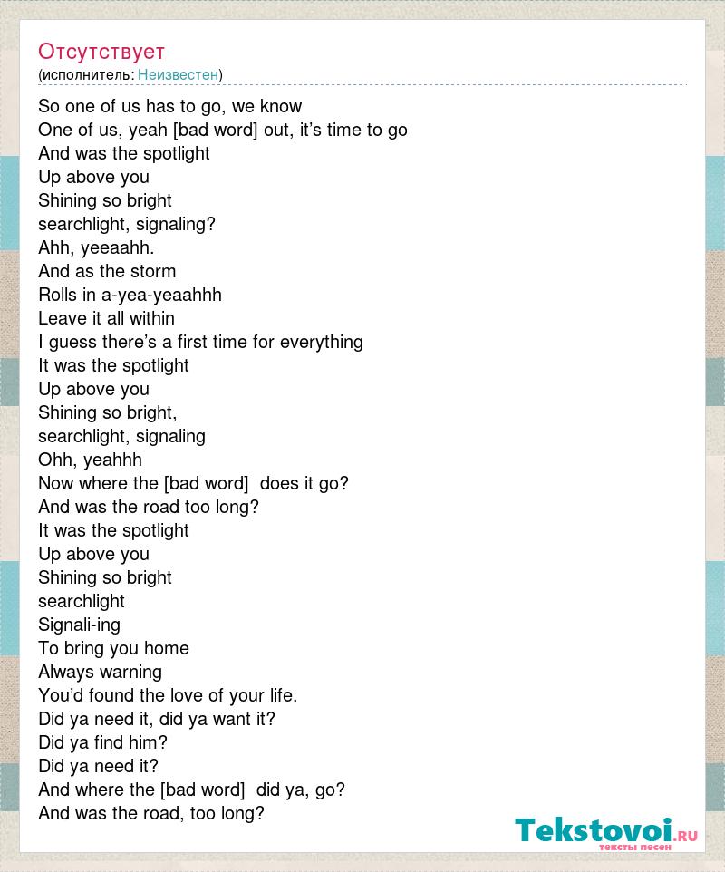 So one of us has to go, we know One of us, yeah [bad word] out, it’s time to go And was the spotlight Up above you Shining so bright searchlight, signaling? Ahh, yeeaahh. And as the storm Rolls in a-yea-yeaahhh Leave it all within I guess there’s a first time for everything It was the spotlight Up above you Shining so bright, searchlight, signaling Ohh, yeahhh Now where the [bad word] does it go? And was the road too long? It was the spotlight Up above you Shining so bright searchlight Signali-ing To bring you home Always warning You’d found the love of your life. Did ya need it, did ya want it? Did ya find him? Did ya need it? And where the [bad word] did ya, go? And was the road, too long?