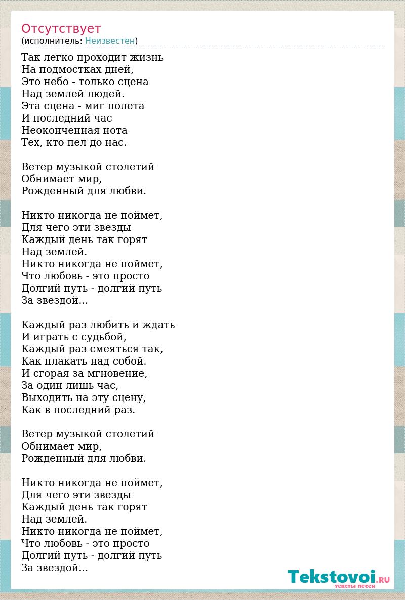 Так легко проходит жизнь На подмостках дней, Это небо - только сцена Над землей людей. Эта сцена - миг полета И последний час Неоконченная нота Тех, кто пел до нас. Ветер музыкой столетий Обнимает мир, Рожденный для любви. Никто никогда не поймет, Для чего эти звезды Каждый день так горят Над землей. Никто никогда не поймет, Что любовь - это просто Долгий путь - долгий путь За звездой... Каждый раз любить и ждать И играть с судьбой, Каждый раз смеяться так, Как плакать над собой. И сгорая за мгновение, За один лишь час, Выходить на эту сцену, Как в последний раз. Ветер музыкой столетий Обнимает мир, Рожденный для любви. Никто никогда не поймет, Для чего эти звезды Каждый день так горят Над землей. Никто никогда не поймет, Что любовь - это просто Долгий путь - долгий путь За звездой...