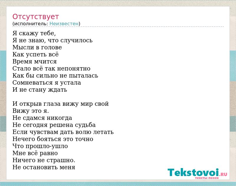 Я скажу тебе, Я не знаю, что случилось Мысли в голове Как успеть всё Время мчится Стало всё так непонятно Как бы сильно не пыталась Сомневаться я устала И не стану ждать И открыв глаза вижу мир свой Вижу это я. Не сдамся никогда Не сегодня решена судьба Если чувствам дать волю летать Нечего бояться это точно Что прошло-ушло Мне всё равно Ничего не страшно. Не остановить меня