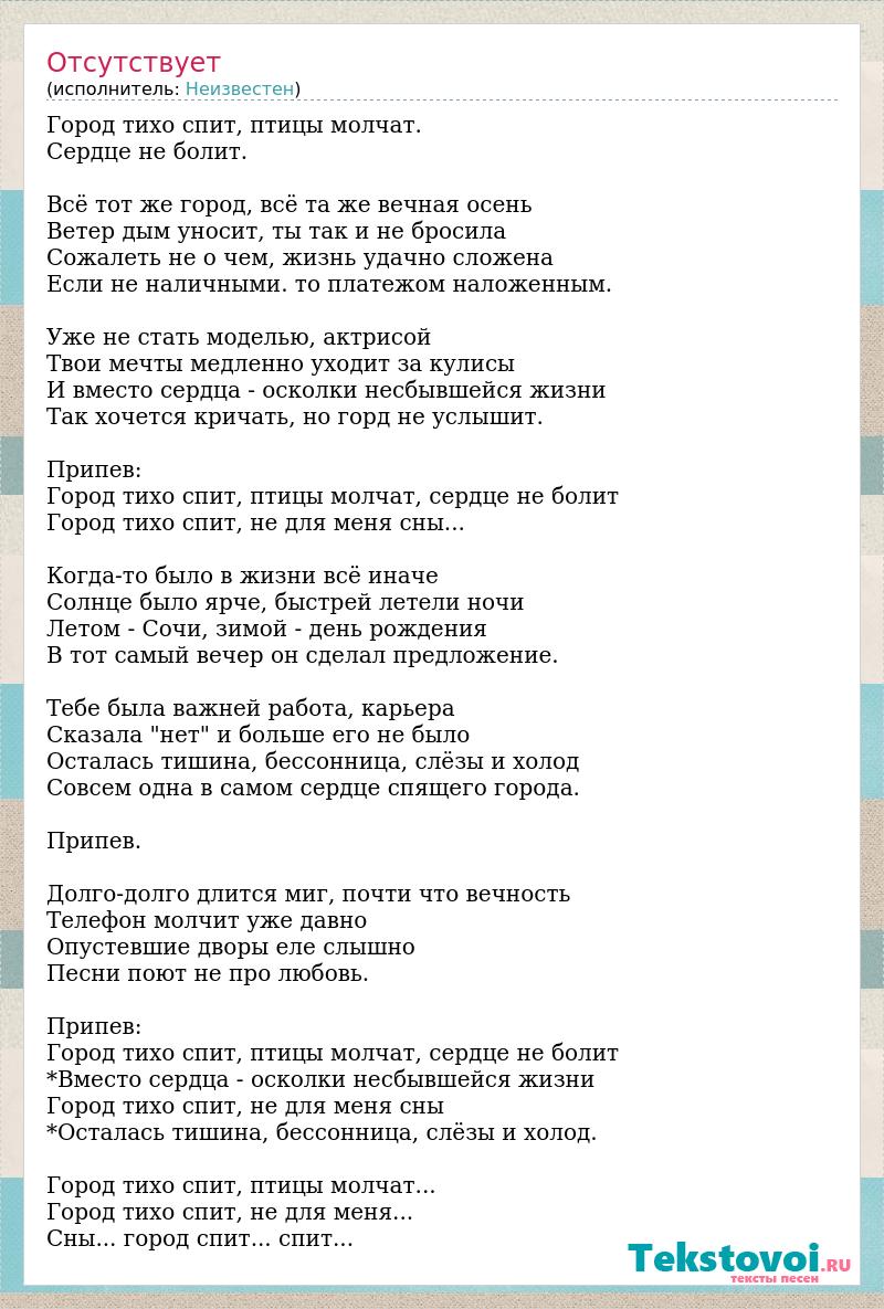 Город тихо спит, птицы молчат. Сердце не болит. Всё тот же город, всё та же вечная осень Ветер дым уносит, ты так и не бросила Сожалеть не о чем, жизнь удачно сложена Если не наличными. то платежом наложенным. Уже не стать моделью, актрисой Твои мечты медленно уходит за кулисы И вместо сердца - осколки несбывшейся жизни Так хочется кричать, но горд не услышит. Припев: Город тихо спит, птицы молчат, сердце не болит Город тихо спит, не для меня сны... Когда-то было в жизни всё иначе Солнце было ярче, быстрей летели ночи Летом - Сочи, зимой - день рождения В тот самый вечер он сделал предложение. Тебе была важней работа, карьера Сказала "нет" и больше его не было Осталась тишина, бессонница, слёзы и холод Совсем одна в самом сердце спящего города. Припев. Долго-долго длится миг, почти что вечность Телефон молчит уже давно Опустевшие дворы еле слышно Песни поют не про любовь. Припев: Город тихо спит, птицы молчат, сердце не болит *Вместо сердца - осколки несбывшейся жизни Город тихо спит, не для меня сны *Осталась тишина, бессонница, слёзы и холод. Город тихо спит, птицы молчат... Город тихо спит, не для меня... Сны... город спит... спит...